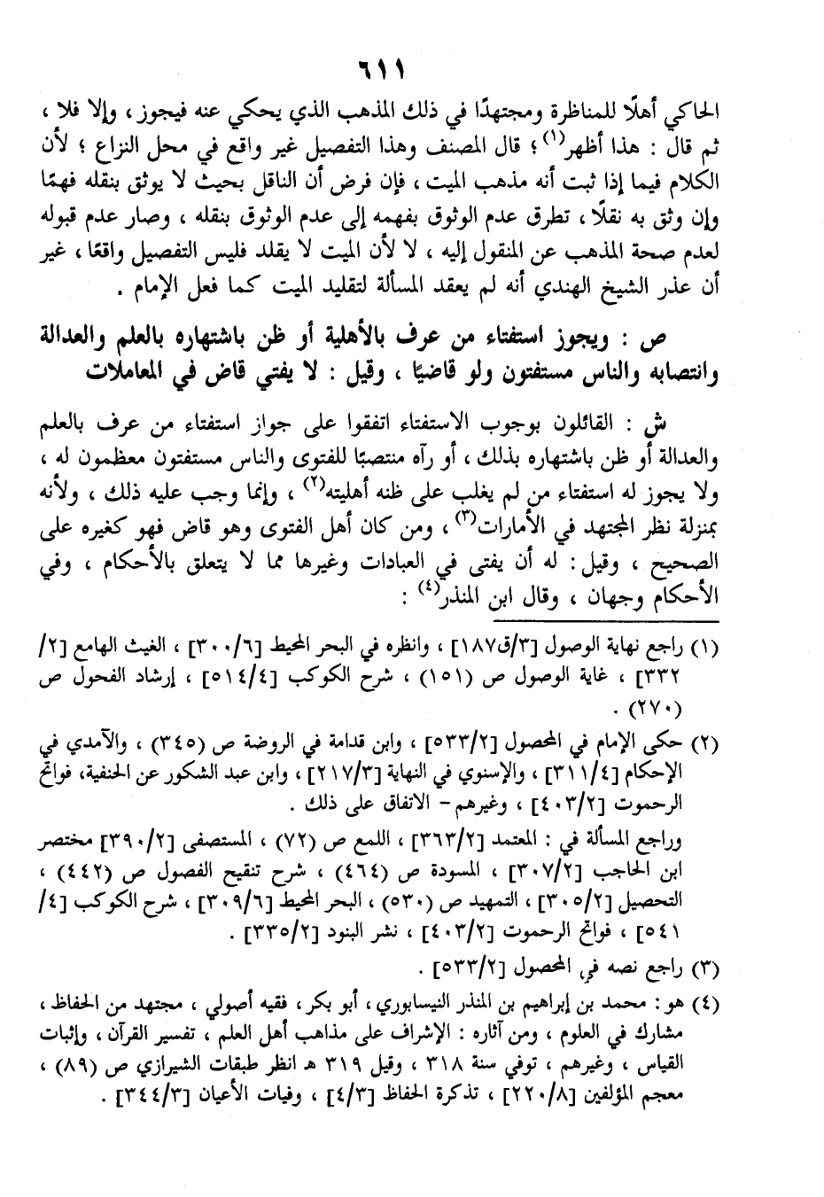 الحاكي أهلا للمناظرة ومجتهدا في ذلك المذهب الذي يحكي عنه فيجوز، وإلا فلا، ثم قال: هذا أظهر، قال المصنف وهذا التفصيل غير واقع في محل النزاع، لأن الكلام فيما إذا ثبت أنه مذهب الميت، فإن فرض أن الناقل بحيث لا يوثق بنقله فهما وإن وثق به نقلا، تطرق عدم الوثوق بفهمه إلى عدم الوثوق بنقله، وصار عدم قبوله لعدم صحة المذهب عن المنقول إليه، لا لأن الميت لا يقلد فليس التفصيل واقعا، غير أن عذر الشيخ الهندي أنه لم يعقد المسألة لتقليد الميت كما فعل الإمام.