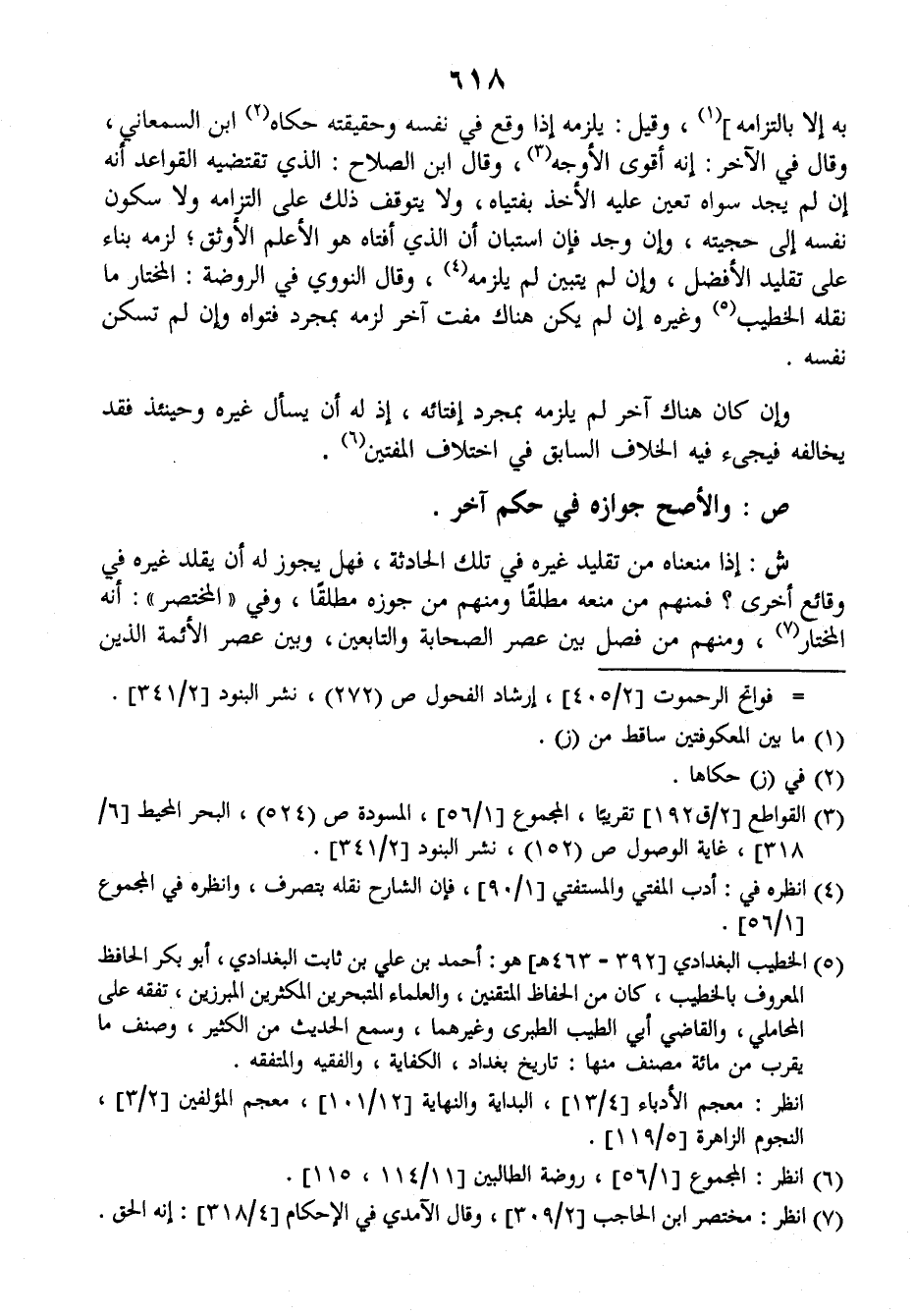 ش: إذا منعناه من تقليد غيره في تلك الحادثة، فهل يجوز له أن يقلد غيره في وقائع أخرى؟ فمنهم من منعه مطلقا ومنهم من جوزه مطلقا، وفي (المختصر): أنه المختار ومنهم من فصل بين عصر الصحابة والتابعين، وبين عصر الأئمة الذين