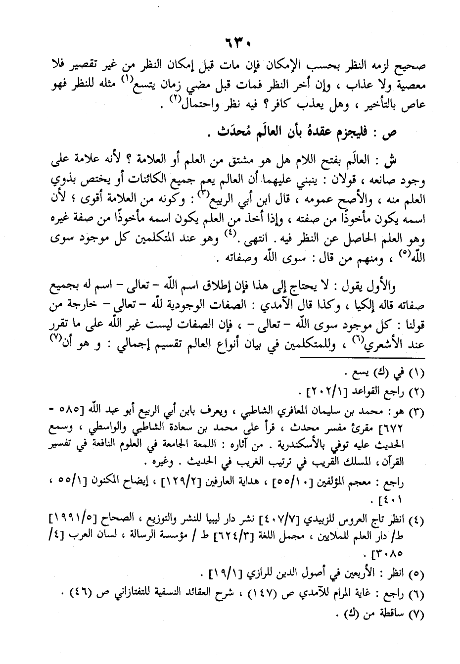 ش: العالم بفتح اللام هل هو مشتق من العلم أو العلامة؟ لأنه علامة على وجود صانعه، قولان: ينبني عليهما أن العالم يعم جميع الكائنات أو يختص بذوي العلم منه، والأصح عمومه، قال ابن أبي الربيع: وكونه من العلامة أقوى، لأن اسمه يكون مأخوذا من صفته، وإذا أخذ من العلم يكون اسمه مأخوذا من صفة غيره وهو العلم الحاصل عن النظر فيه. انتهى. وهو عند المتكلمين كل موجود سوى الله ومنهم من قال: سوى الله وصفاته.