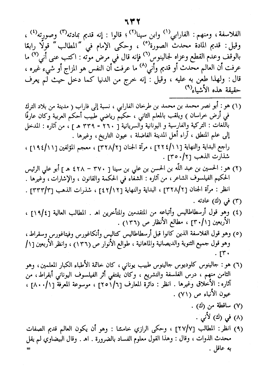 الفلاسفة ومنهم: الفارابي، وابن سينا قالوا: إنه قديم بمادته وصورته وقيل: قديم المادة محدث الصورة وحكى الإمام في (المطالب) قولا رابعا بالوقف وعدم القطع وعزاه لجالينوس فإنه قال في مرض موته: اكتب عني أني ما عرفت أن العالم محدث أو قديم وأني ما عرفت أن النفس هو المزاج أو شيء غيره، قال: ولهذا طعن به عليه، وقيل: إنه خرج من الدنيا كما دخل حيث لم يعرف حقيقة هذه الأشياء.
