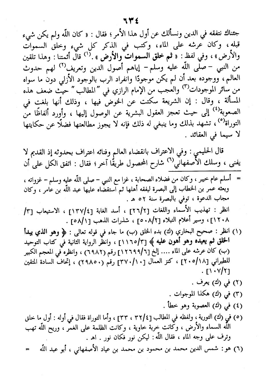 جئناك نتفقه في الدين ونسألك عن أول هذا الأمر، فقال: ((كان الله ولم يكن شيء قبله وكان عرشه على الماء، وكتب في الذكر، كل شيء وخلق السماوات والأرض)) وفي لفظ: ((ثم خلق السماوات والأرض)) قال أئمتنا: وهذا تلقين من النبي صلى الله عليه وسلم إياهم أصول الدين وتعريف لهم حدوث العالم، ووجوده بعد أن لم يكن موجودا وانفراد الرب بالوجود الأزلي دون ما سواه من سائر الموجودات والعجب من الإمام الرازي في (المطالب) حيث ضعف هذه المسألة، وقال: إن الشريعة سكتت عن الخوض فيها، وذلك أنها بلغت في الصعوبة إلى حيث تعجز العقول البشرية عن الوصول إليها، وأورد ألفاظا من التوراة تشهد بذلك وما ينبغي له ذلك فإنه لا يجوز مطالعتها فضلا عن حكايتها لا سيما في العقائد.