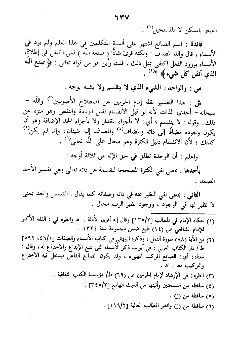 ش: هذا التفسير نقله إمام الحرمين عن اصطلاح الأصوليين والله سبحانه أحدي الذات لأنه لو قبل الانقسام لقبل الزيادة والنقص وهو منزه عن ذلك. وقوله: لا ينقسم، أي: لا بأجزاء المقدار ولا بأجزاء الحد الإضافة وهو أن يكون وجوده مضافا إلى ذاته والمضاف والمضاف إليه شيئان، وإنما لم يكن كذلك، لأن الانقسام دليل الكثرة وهو محال على الله تعالى.