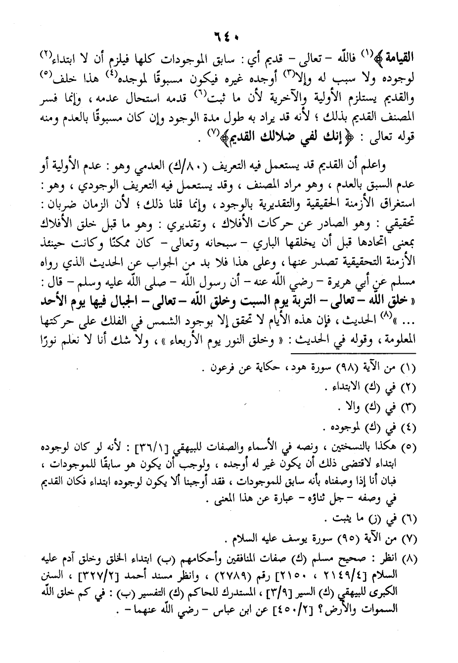 واعلم أن القديم قد يستعمل فيه التعريف (٨٠/ك) العدمي وهو: عدم الأولية أو عدم السبق بالعدم، وهو مراد المصنف، وقد يستعمل فيه التعريف الوجودي، وهو: استغراق الأزمنة الحقيقية والتقديرية بالوجود، وإنما قلنا ذلك، لأن الزمان ضربان: تحقيقي: وهو الصادر عن حركات الأفلاك، وتقديري: وهو ما قبل خلق الأفلاك بمعنى اتحادها قبل أن يخلقها الباري سبحانه وتعالى كان ممكنا وكانت حينئذ الأزمنة التحقيقية تصدر عنها، وعلى هذا فلا بد من الجواب عن الحديث الذي رواه مسلم عن أبي هريرة رضي الله عنه أن رسول الله صلى الله عليه وسلم قال: ((خلق الله تعالى التربة يوم السبت وخلق الله تعالى الجبال فيها يوم الأحد)) الحديث فإن هذه الأيام لا تحقق إلا بوجود الشمس في الفلك على حركتها المعلومة، وقوله في الحديث: ((وخلقا النور يوم الأربعاء)) ولا شك أنا لا نعلم نورا