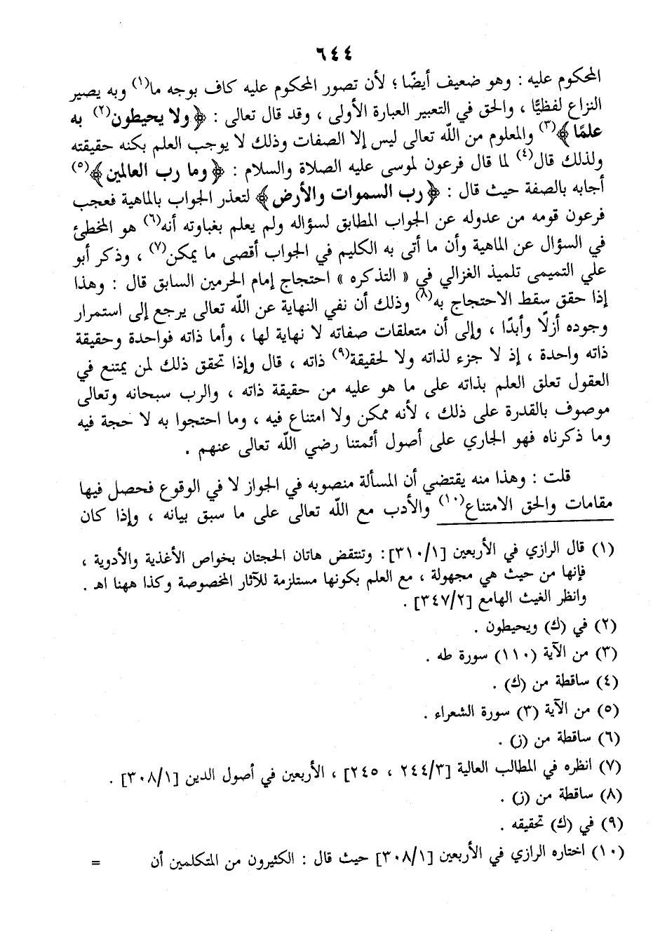 المحكوم عليه: وهو ضعيف أيضا، لأن تصور المحكوم عليه كاف بوجه ما وبه يصير النزاع لفظياً، والحق في التعبير العبارة الأولى، وقد قال تعالى: {ولا يحيطون به علما} والمعلوم من الله تعالى ليس إلا الصفات وذلك لا يوجب العلم بكنه حقيقته ولذلك قال لما قال فرعون لموسى عليه الصلاة والسلام: {وما رب العالمين} أجابه بالصفة حيث قال: {رب السماوات والأرض} لتعذر الجواب بالماهية فعجب فرعون قومه من عدوله عن الجواب المطابق لسؤاله ولم يعلم بغباوته أنه هو المخطئ في السؤال عن الماهية وأن ما أتى به الكليم في الجواب أقصى ما يمكن وذكر أبو علي التميمي تلميذ الغزالي في (التذكرة) احتجاج إمام الحرمين السابق قال: وهذا إذا حقق سقط الاحتجاج به وذلك أن نفي النهاية عن الله تعالى يرجع إلى استمرار وجوده أزلا وأبدا، وإلى أن متعلقات صفاته لا نهاية لها وأما ذاته فواحدة وحقيقة ذاته واحدة، إذ لا جزء لذاته ولا لحقيقة ذاته، قال وإذا تحقق ذلك لمن يمتنع في العقول تعلق العلم بذاته على ما هو عليه من حقيقة ذاته، والرب سبحانه وتعالى موصوف بالقدرة على ذلك، لأنه ممكن ولا امتناع فيه، وما احتجوا به لا حجة فيه وما ذكرناه فهو الجاري على أصول أئمتنا رضي الله تعالى عنهم.