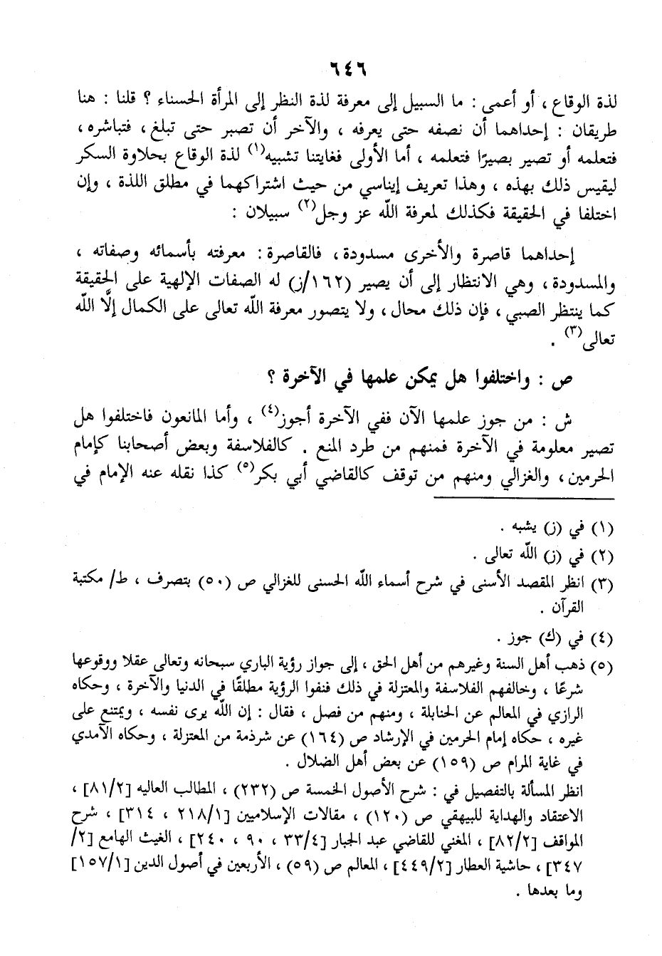 لذة الوقاع، أو أعمى: ما السبيل إلى معرفة لذة النظر إلى المرأة الحسناء؟ قلنا: هنا طريقان: إحداهما أن نصفه حتى يعرفه، والآخر أن تصبر حتى تبلغ، فتباشره فتعلمه أو تصير بصيرا فتعلمه، أما الأولى فغايتنا تشبيه لذة الوقاع بحلاوة السكر ليقيس ذلك بهذه، وهذا تعريف إيناسي من حيث اشتراكهما في مطلق اللذة، وإن اختلفا في الحقيقة فكذلك لمعرفة الله عز وجل سبيلان:
