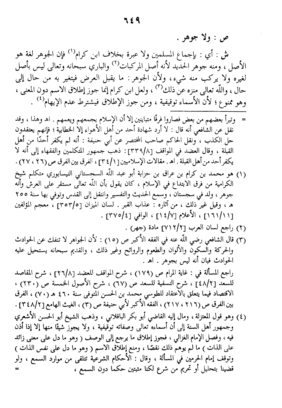 ش: أي: بإجماع المسلمين ولا عبرة بخلاف ابن كرام فإن الجوهر لغة هو الأصل، ومنه جوهر الحديد لأنه أصل المركبات والباري سبحانه وتعالى ليس بأصل لغيره ولا يركب منه شيء، ولأن الجوهر: ما يقبل العرض فيتغير به من حال إلى حال، والله تعالى منزه عن ذلك، ولعل ابن كرام إنما جوز إطلاق الاسم دون المعنى وهو ممنوع، لأن الأسماء توقيفية ومن جوز الإطلاق فيشترط عدم الإيهام.