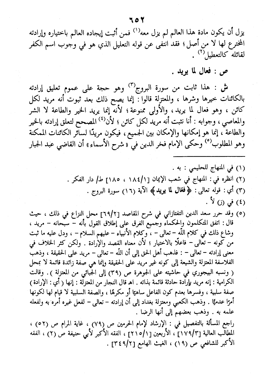 ش: هذا ثابت من سورة البروج وهو حجة على عموم تعليق إرادته بالكائنات خيرها وشرها، والمعتزلة قالوا: إنما يصح ذلك بعد ثبوت أنه مريد لكل كائن، وهو فعال لما يريد، والأولى ممنوعة، لأنه إنما يريد الخير والطاعة لا الشر والمعاصي، وجوابه: أنا نثبت أنه مريد لكل كائن، لأن المصحح لتعلق إرادته بالخير والطاعة، وإنما هو إمكانها والإمكان بين الجميع، فيكون مريدا لسائر الكائنات الممكنة وهو المطلوب وحكى الإمام فخر الدين في (شرح الأسماء) أن القاضي عبد الجبار