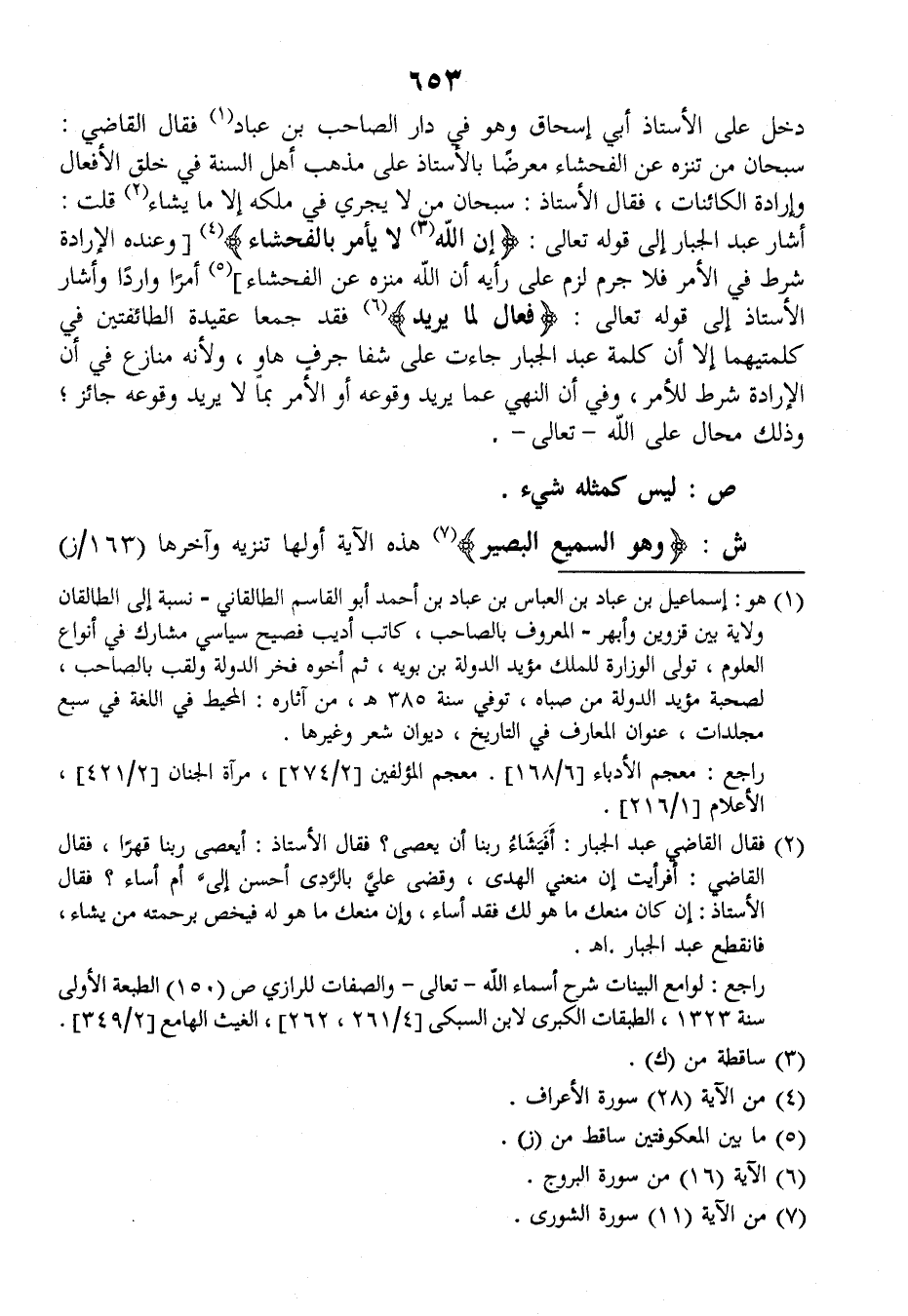 دخل على الأستاذ أبي إسحاق وهو في دار الصاحب بن عباد فقال القاضي: سبحان من تنزه عن الفحشاء معرضا بالأستاذ على مذهب أهل السنة في خلق الأفعال وإرادة الكائنات فقال الأستاذ: سبحان من لا يجري في ملكه إلا ما يشاء قلت: أشار عبد الجبار إلى قوله تعالى: {إن الله لا يأمر بالفحشاء} وعنده الإرادة شرط في الأمر فلا جرم لزم على رأيه أن الله منزه عن الفحشاء أمرا واردا وأشار الأستاذ إلى قوله تعالى: {فعال لما يريد} فقد جمعا عقيدة الطائفتين في كلمتيهما إلا أن كلمة عبد الجبار جاءت على شفا جرف هاو، ولأنه منازع في أن الإرادة شرط للأمر، وفي أن النهي عما يريد وقوعه أو بالأمر بما لا يريد وقوعه جائز، وذلك محال على الله تعالى.