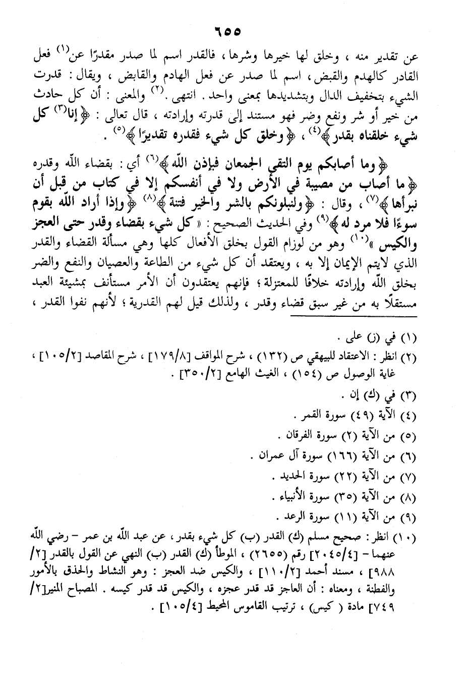 عن تقدير منه، وخلق لها خيرها وشرها، فالقدر اسم لما صدر مقدرا عن فعل القادر كالهدم والقبض، اسم لما صدر عن فعل الهادم والقابض، ويقال: قدرت الشيء بتخفيف الدال وبتشديدها بمعنى واحد. انتهى. والمعنى: أن كل حادث من خير أو شر ونفع وضر فهو مستند إلى قدرته وإرادته قال تعالى: {إنا كل شيء خلقناه بقدر} {وخلق كل شيء فقدره تقديرا}.