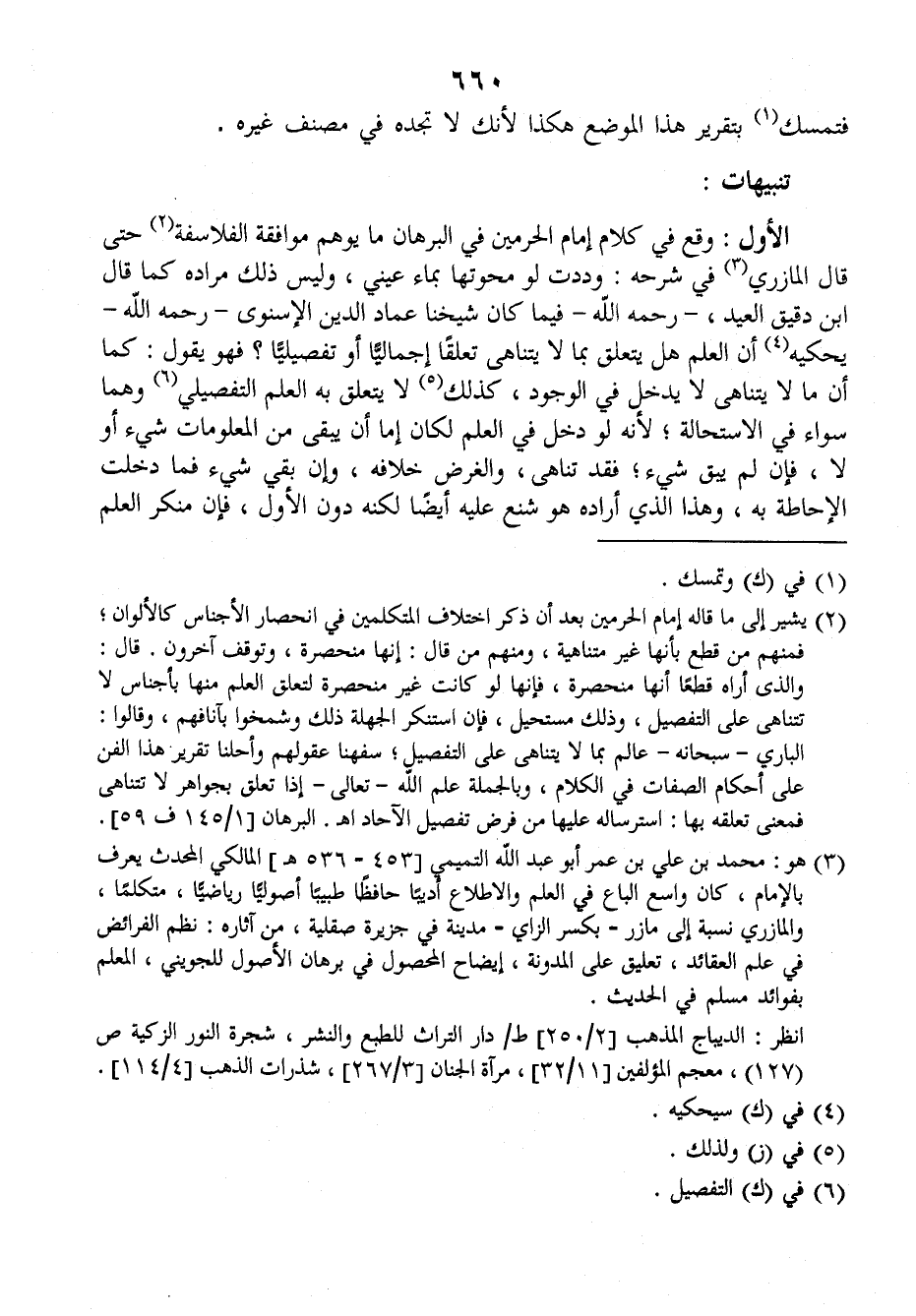 الأول: وقع في كلام إمام الحرمين في (البرهان) ما يوهم موافقة الفلاسفة حتى قال المازري في شرحه: وددت لو محوتها بماء عيني، وليس ذلك مراده كما قال ابن دقيق العيد رحمه الله فيما كان شيخنا عماد الدين الإسنوي رحمه الله يحكيه أن العلم هل يتعلق بما لا يتناهى تعلقا إجماليا أو تفصيليا؟ فهو يقول: كما أن ما لا يتناهى لا يدخل في الوجود، كذلك لا يتعلق به العلم التفصيلي وهما سواء في الاستحالة لأنه لو دخل في العلم لكان إما أن يبقى من المعلومات شيء أو لا، فإن لم يبق شيء، فقد تناهى والغرض خلافه، وإن بقي شيء فما دخلت الإحاطة به، وهذا الذي أراده هو شنع عليه أيضا لكنه دون الأول، فإن منكر العلم