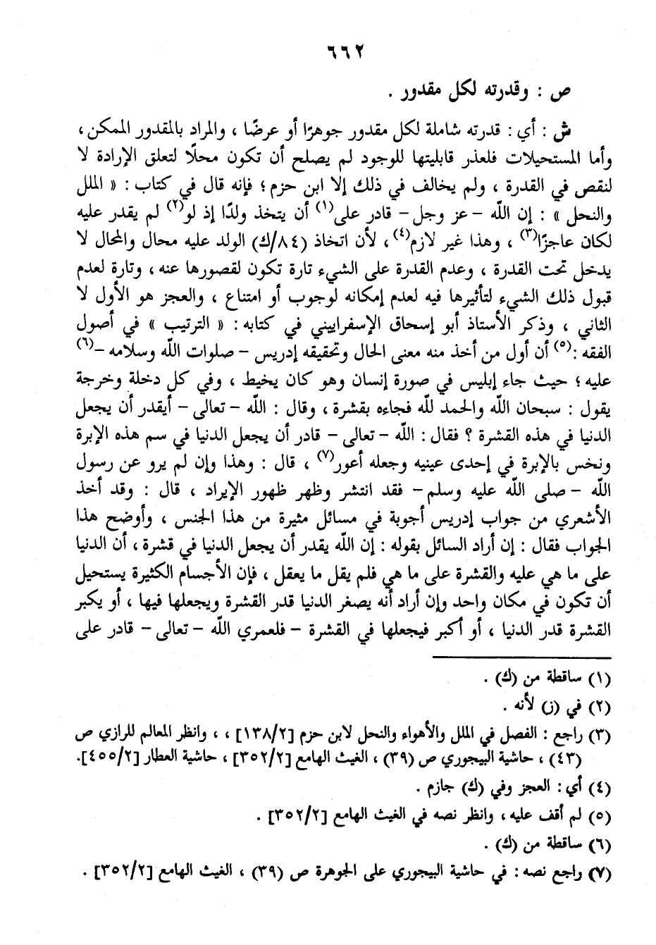 ش: أي: قدرته شاملة لكل مقدور جوهراً أو عرضا، والمراد بالمقدور الممكن وأما المستحيلات فلعذر قابليتها للوجود لم يصلح أن تكون محلا لتعلق الإرادة لا لنقص في القدرة، ولم يخالف في ذلك إلا ابن حزم، فإنه قال في كتاب: (الملل والنحل): إن الله عز وجل قادر على أن يتخذ ولدا إذ لو لم يقدر عليه لكان عاجزا وهذا غير لازم لأن اتخاذ (٨٤/ك) الولد عليه محال والمحال لا يدخل تحت القدرة، وعدم القدرة على الشيء تارة تكون لقصورها عنه، وتارة لعدم قبول ذلك الشيء لتأثيرها فيه لعدم إمكانه لوجوب أو امتناع، والعجز هو الأول لا الثاني، وذكر الأستاذ أبو إسحاق الإسفراييني في كتابه: (الترتيب) في أصول الفقه أن أول من أخذ منه معنى الحال وتحقيقه إدريس صلوات الله وسلامه عليه حيث جاء إبليس في صورة إنسان وهو كان يخيط، وفي كل دخلة وخرجة يقول: سبحان الله والحمد لله فجاءه بقشرة وقال: الله تعالى أيقدر أن يجعل الدنيا في هذه القشرة؟ فقال: الله تعالى قادر أن يجعل الدنيا في سم هذه الإبرة ونخس الإبرة في إحدى عينيه وجعله أعور قال: وهذا وإن لم يرو عن رسول الله صلى الله عليه وسلم فقد انتشر وظهر ظهور الإيراد، قال: وقد أخذ الأشعري من جواب إدريس أجوبة في مسائل مثيرة من هذا الجنس، وأوضح هذا الجواب فقال: إن أراد السائل بقوله: إن الله يقدر أن يجعل الدنيا في قشرة أن الدنيا على ما هي عليه والقشرة على ما هي فلم يقل ما يعقل، فإن الأجسام الكثيرة يستحيل أن تكون في مكان واحد وإن أراد أنه يصغر الدنيا قدر القشرة ويجعلها فيها أو يكبر القشرة قدر الدنيا، أو أكبر فيجعلها في القشرة فلعمري الله تعالى قادر على