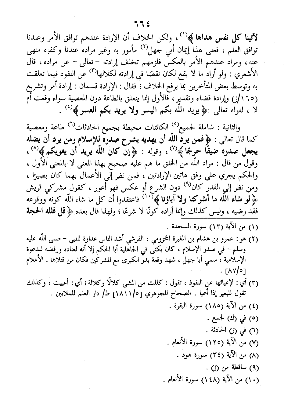 والثانية: شاملة لجميع الكائنات محيطة بجميع الحادثات طاعة ومعصية كما قال تعالى: {فمن يرد الله أن يهديه يشرح صدره للإسلام ومن يرد أن يضله يجعل صدره ضيقا حرجا} وقوله: {إن كان الله يريد أن يغويكم} وقول من قال: مراد الله من الخلق ما هم عليه صحيح بهذا المعنى، لا بالمعنى الأول، والحكم يجري على وفق هاتين الإرادتين، فمن نظر إلى الأعمال بهما كان بصيرا ومن نظر إلى القدر كان دون الشرع أو عكس فهو أعور، كقول مشركي قريش: {لو شاء الله ما أشركنا ولا آباؤنا} فاعتقدوا أن كل ما شاء الله كونه ووقوعه فقد رضيه وليس كذلك وإنما أراده كونا لا شرعا ولهذا قال بعده: {قل فلله الحجة