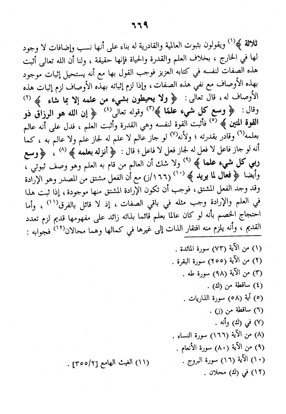 ثلاثة} ويقولون بثبوت العالمية والقادرية له بناء على أنها نسب وإضافات لا وجود لها في الخارج بخلاف العلم والقدرة والحياة فإنها حقيقة، ولنا أن الله تعالى أثبت هذه الصفات لنفسه في كتابه العزيز فوجب القول بها مع أنه يستحيل إثبات موجود بهذه الأوصاف مع نفي هذه الصفات وإذا لزم إثباته بهذه الأوصاف لزم إثبات هذه الأوصاف له، قال تعالى: {ولا يحيطون بشيء من علمه إلا بما شاء} وقال: {وسع كل شيء علما} وقوله تعالى: {إن الله هو الرازق ذو القوة المتين} فأثبت القوة لنفسه وهي القدرة وأثبت العلم، فدل على أنه عالم بعلمه وقادر بقدرته، ولأنه لو جاز عالم لا علم له لجاز علم ولا عالم به، كما أنه لو جاز فاعل لا فعل له لجاز فعل لا فاعل قال: {أنزله بعلمه} {وسع ربي كل شيء علما} ولا شك أن العالم من قام به العلم هو وصف ثبوتي وأيضا {فعال لما يريد} (١٦٦/ز) مع أن الفعل مشتق من المصدر وهو الإرادة وقد وجد الفعل المشتق، فوجب أن تكون الإرادة المشتق منها موجودة، إذا ثبت هذا في العلم والإرادة وجب مثله في باقي الصفات، إذ لا قائل بالفرق وأما احتجاج الخصم بأنه لو كان عالما بعلم قائما بذاته زائد على مفهومها قديم لزم تعدد القديم، وأنه يلزم منه افتقار الذات إلى غيرها في كمالها وهما محالان فجوابه: