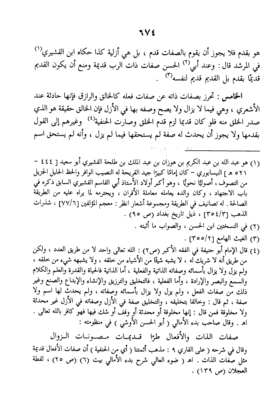 الخامس: تحرز بصفات ذاته عن صفات فعله كالخالق والرازق فإنها حادثة عند الأشعري، وهي فيما لا يزال ولا يصح وصفه بها في الأزل فإن الخالق حقيقة هو الذي صدر الخلق منه فلو كان قديما لزم قدم الخلق وصارت الحنفية وغيرهم إلى القول بقدمها ولا يجوز أن يحدث له صفة لم يستحقها فيما لم يزل، وأنه لم يستحق اسم