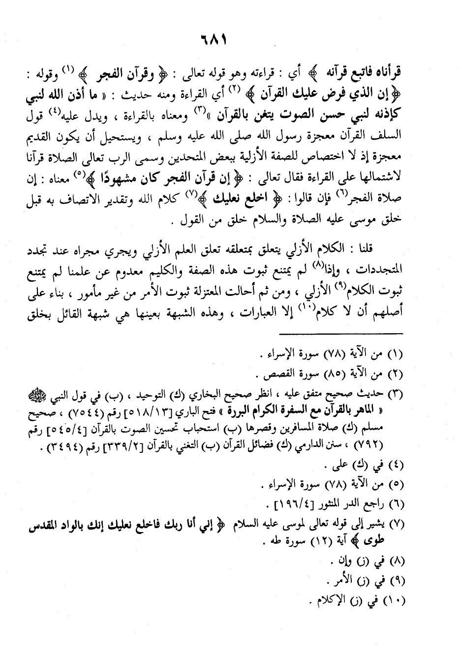 قرأناه فاتبع قرآنه} أي: قراءته وهو قوله تعالى: {وقرآن الفجر} وقوله: {إن الذي فرض عليك القرآن} أي القراءة ومنه حديث: ((ما أذن لله لنبي كإذنه لنبي حسن الصوت يتغن بالقرآن)) ومعناه بالقراءة ويدل عليه قول السلف القرآن معجزة رسول الله صلى الله عليه وسلم ويستحيل أن يكون القديم معجزة إذ لا اختصاص للصفة الأزلية ببعض المتحدين وسمى الرب تعالى الصلاة قرآنا لاشتمالها على القراءة فقال تعالى: {إن قرآن الفجر كان مشهودا} معناه: إن صلاة الفجر، فإن قالوا: {اخلع نعليك} كلام الله وتقدير الاتصاف به قبل خلق موسى عليه الصلاة والسلام خلق من القول.