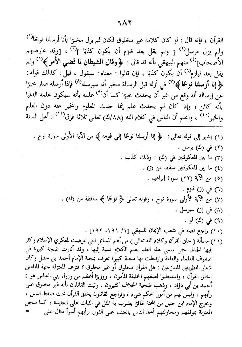 القرآن فإنه قال: لو كان كلامه غير مخلوق لكان لم يزل مخبرا بأنا أرسلنا نوحا ولم يزل موسل ولم يقل بعد فلزم أن يكون كذبا وقد عارضهم الأصحاب منهم البيهقي بأنه قد قال: {وقال الشيطان لما قضي الأمر} ولم يقل بعد فيلزم أن يكون كذبا، فإن قالوا: معناه: سيقول، قيل: كذلك قوله: {إنا أرسلنا نوحا} في أزله قبل الرسالة مخبر أنه سيرسله فإذا أرسله صار خبرا عن إرساله أنه وقع من غير أن يحدث خبرا كما أن علمه بأنه سيكون علمه الدنيا بأنه كائن وإذا كان لم يحدث علم إنما حدث المعلوم والمخبر عنه دون العلم والخبر واعلم أن الناس في كلام الله (٨٨/ك) تعالى ثلاثة فرق: أهل السنة