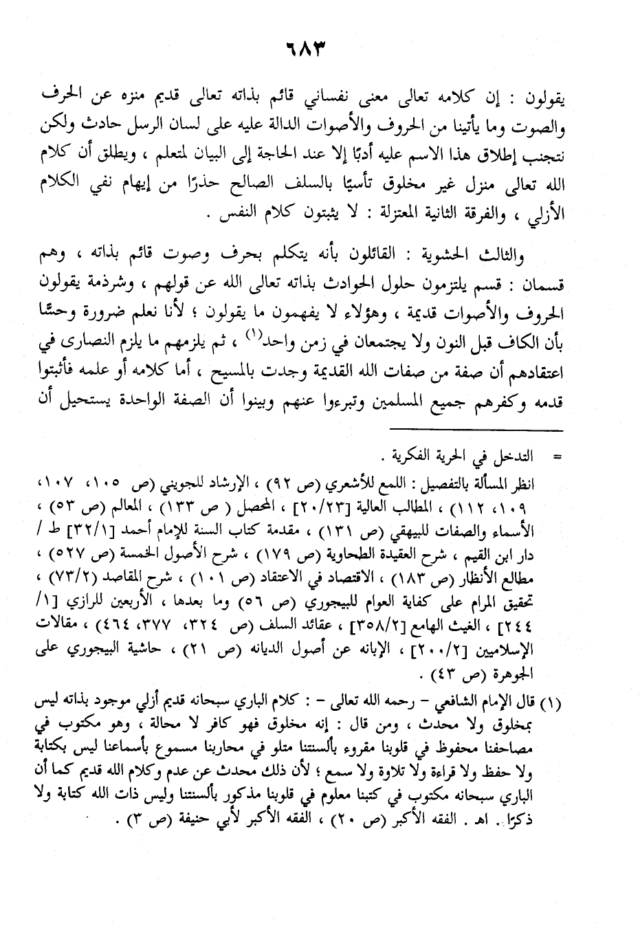 والثالث الحشوية: القائلون بأنه يتكلم بحرف وصوت قائم بذاته، وهم قسمان: قسم يلتزمون حلول الحوادث بذاته تعالى الله عن قولهم، وشرذمة يقولون الحروف والأصوات قديمة، وهؤلاء لا يفهمون ما يقولون، لأنا نعلم ضرورة وحسا بأن الكاف قبل النون ولا يجتمعان في زمن واحد، ثم يلزمهم ما يلزم النصارى في اعتقادهم أن صفة من صفات الله القديمة وجدت المسيح، أما كلامه أو علمه فأثبتوا قدمه وكفرهم جميع المسلمين وتبرؤوا عنهم وبينوا أن الصفة الواحدة يستحيل أن