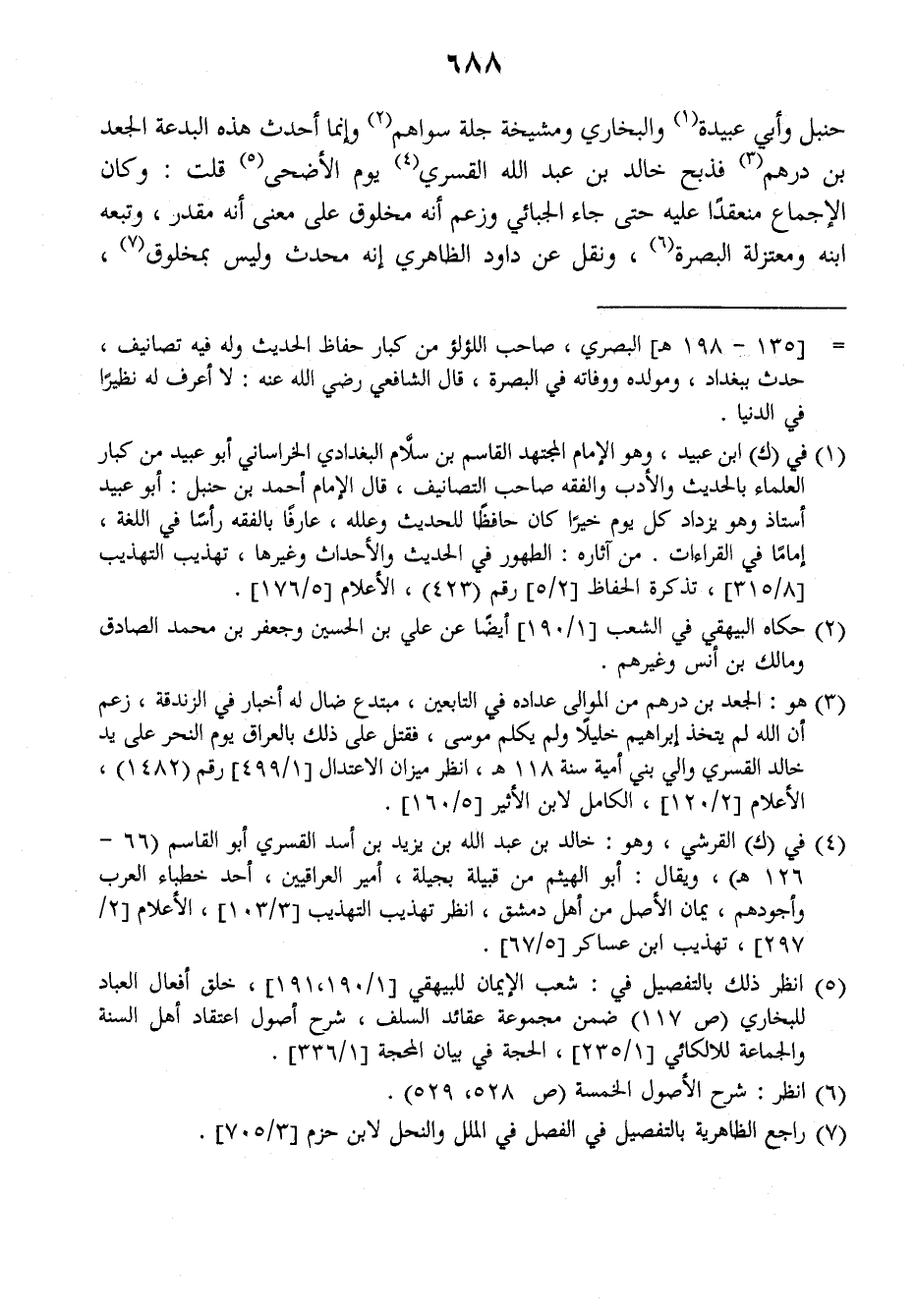 حنبل وأبي عبيدة والبخاري ومشيخة جلة سواهم وإنما أحدث هذه البدعة الجعد بن درهم فذبح= خالد بن عبد الله القسري يوم الأضحى قلت: وكان الإجماع منعقدا عليه حتى جاء الجبائي وزعم أنه