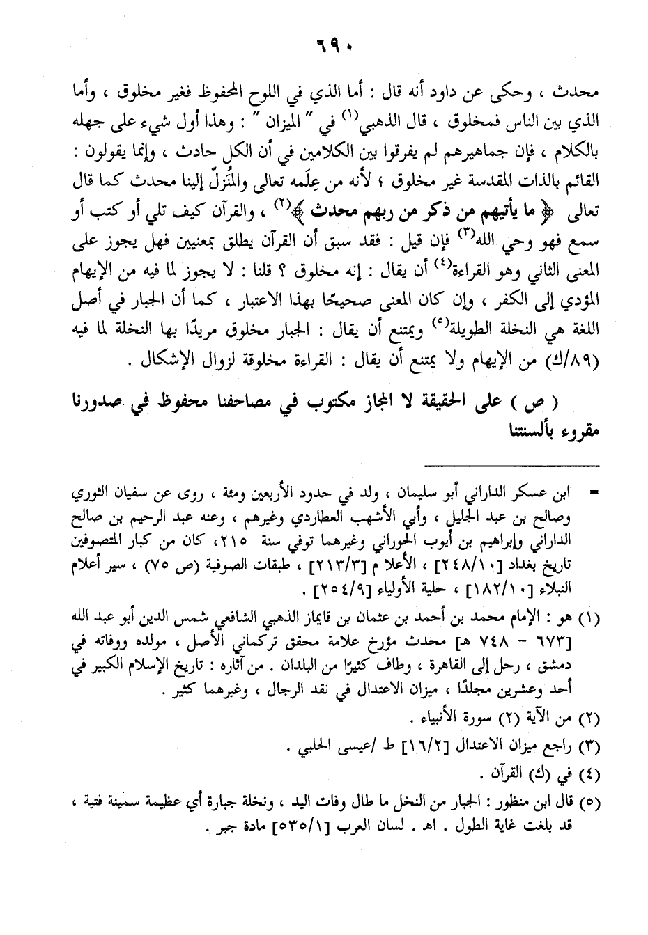 محدث، وحكى عن داود أنه قال: أما الذي في اللوح المحفوظ فغير مخلوق، وأما الذي بين الناس فمخلوق قال الذهبي في (الميزان): وهذا أول شيء على جهله بالكلام فإن جماهيرهم لم يفرقوا بين الكلامين في أن الكل حادث، وإنما يقولون: القائم بالذات المقدسة غير مخلوق، لأنه من علمه تعالى والمنزل إلينا محدث كما قال تعالى: {ما يأتيهم من ذكر من ربهم محدث} والقرآن كيف تلي أو كتب أو سمع فهو وحي الله فإن قيل: فقد سبق أن القرآن يطلق بمعنيين فهل يجوز على المعنى الثاني وهو القراءة أن يقال: إنه مخلوق؟ قلنا: لا يجوز لما فيه من الإيهام المؤدي إلى الكفر، وإن كان المعنى صحيحا بهذا الاعتبار، كما أن الجبار في أصل اللغة هي النخلة الطويلة، ويمتنع أن يقال: الجبار مخلوق مريدا بها النخلة لما فيه (٨٩/ك) من الإيهام ولا يمتنع أن يقال: القراءة مخلوقة لزوال الإشكال.