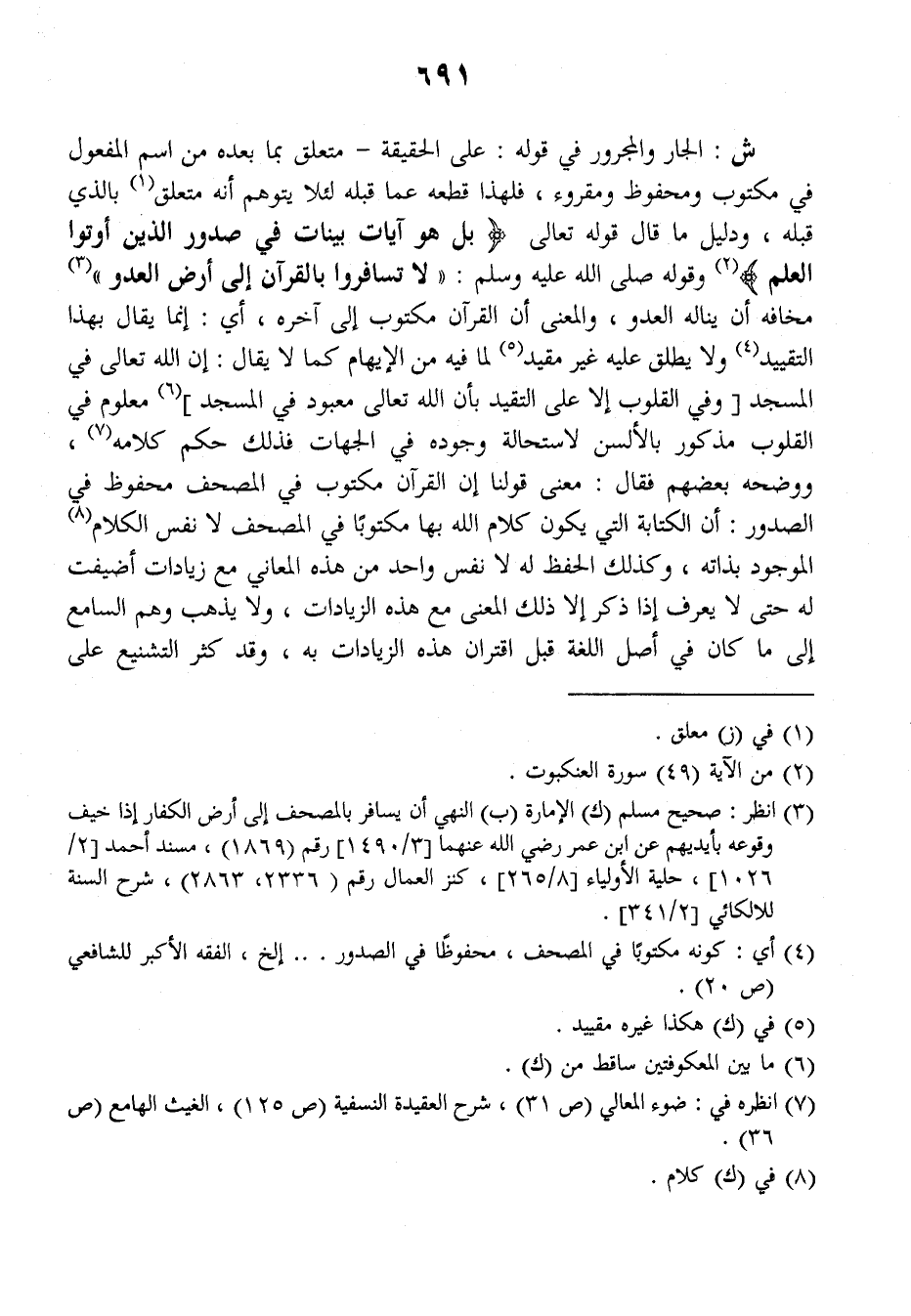 ش: الجار والمجرور في قوله: على الحقيقة - متعلق بما بعده من اسم المفعول في مكتوب ومحفوظ ومقروء، فلهذا قطعه عما قبله لئلا يتوهم أنه متعلق بالذي قبله ودليل ما قال قوله تعالى: {بل هو آيات بينات في صدور الذين أتوا العلم} وقوله صلى الله عليه وسلم: ((لا تسافروا بالقرآن إلى أرض العدو)) مخافة أن يناله العدو، والمعنى أن القرآن مكتوب إلى آخره، أي: إنما يقال بهذا التقييد ولا يطلق عليه غير مقيد لما فيه من الإيهام كما لا يقال: إن الله تعالى في المسجد وفي القلوب إلا على التقيد بأن الله تعالى معبود في المسجد معلوم في القلوب مذكور بالألسن لاستحالة وجوده في الجهات فذلك حكم كلامه ووضحه بعضهم فقال: معنى قولنا إن القرآن مكتوب في المصحف محفوظ في الصدور: أن الكتابة التي يكون كلام الله بها مكتوبا في المصحف لا نفس الكلام الموجود بذاته، وكذلك الحفظ له لا نفس واحد من هذه المعاني مع زيادات أضيفت له حتى لا يعرف إذا ذكر إلا ذلك المعنى مع هذه الزيادات، ولا يذهب وهم السامع إلى من كان في أصل اللغة قبل اقتران هذه الزيادات به، وقد كثر التشنيع على