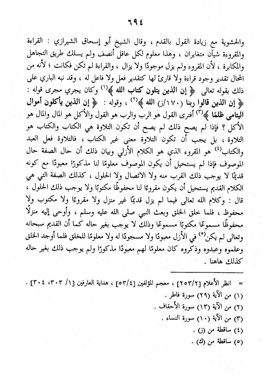 والحشوية مع زيادة القول بالقدم، وقال الشيخ أبو إسحاق الشيرازي: القراءة والمقروءة شيئان متغايران، وهذا معلوم لكل عاقل أنصف ولم يسلك طريق التجاهل والمكابرة لأن المقروء ولم يزل موجودا ولا يزال، والقراءة لم تكن فكانت، لأنه من المحال تقدير وجود قراءة ولا قارئ لها كتقدير فعل ولا فاعل له، وقد نبه الباري على ذلك بقوله تعالى: {إن الذين يتلون كتاب الله} وكان يجري مجرى قوله: