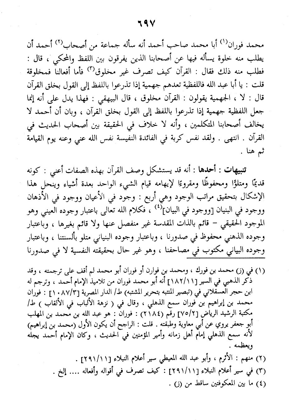 تنبيهات: أحدها: أنه قد يستشكل وصف القرآن بهذه الصفات أعني: كونه قديما ومتلوا ومحفوظا ومقروءا لإيهامه قيام الشيء الواحد بعدة أشياء وينحل هذا الإشكال بتحقيق مراتب الوجود وهي أربع: وجود في الأعيان ووجوده في الأذهان ووجود في البنيان ووجود في البيان فكلام الله تعالى باعتبار وجوه العيني وهو الموجود الحقيقي - قائم بالذات المقدسة غير منفصل عنها ولا قائم بغيرها، وباعتبار وجوده الذهني محفوظ في صدورنا، وباعتبار وجوده البنياني متلو بألسنتنا وباعتبار وجوده البياني مكتوب في مصاحفنا، وهو غير حال بحقيقته النفسية لا في صدورنا