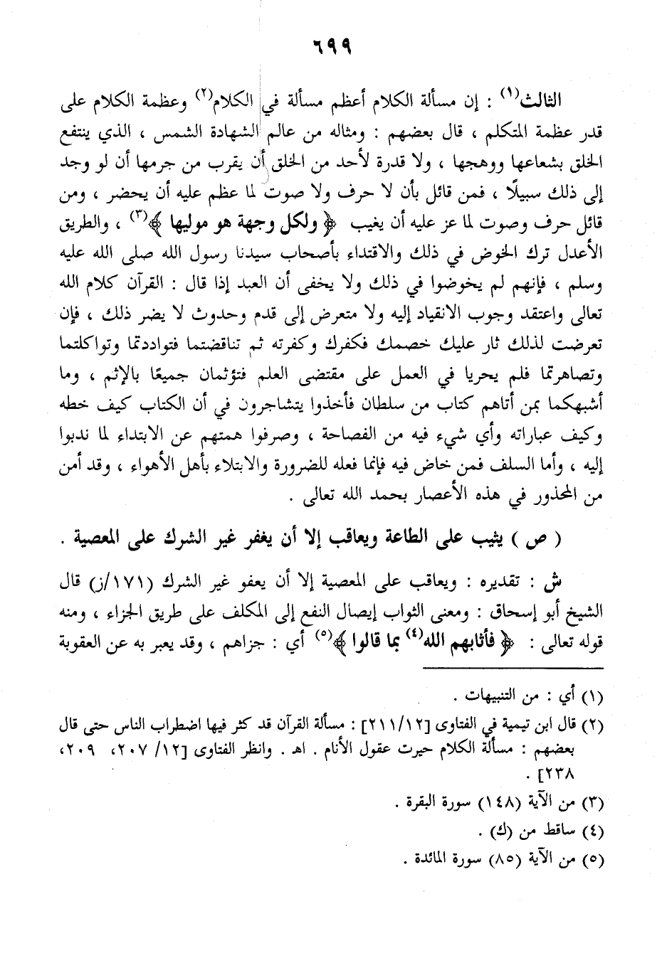 الثالث: إن مسألة الكلام أعظم مسألة في الكلام وعظمة الكلام على قدر عظمة المتكلم، قال بعضهم: ومثاله من عالم الشهادة الشمس، الذي ينتفع الخلق بشعاعها ووهجها، ولا قدرة لأحد من الخلق أن يقرب من جرمها أن لو وجد إلى ذلك سبيلا، فمن قائل بأن لا حرف ولا صوت لما عظم عليه أن يحضر، ومن قائل حرف وصوت لما عز عليه أن يغيب {ولكل وجهة هو موليها} والطريق الأعدل ترك الخوض في ذلك والاقتداء بأصحاب سيدنا رسول الله صلى الله عليه وسلم فإنهم لم يخوضوا في ذلك ولا يخفى أن العبد إذا قال: القرآن كلام الله تعالى واعتقد وجوب الانقياد إليه ولا متعرض إلى قدم وحدوث لا يضر بذلك، فإن تعرضت لذلك ثار عليك خصمك فكفرك وكفرته ثم تناقضتما فتواددتما وتواكلتما وتصاهرتما فلم يحريا في العمل على مقتضى العلم فتؤثمان جميعا بالإثم، وما أشبهكما بما أتاهم كتاب من سلطان فأخذوا يتشاجرون في أن الكتاب كيف خطه وكيف عباراته وأي شيء فيه من الفصاحة، وصرفوا همتهم عن الابتداء لما ندبوا إليه، وأما السلف فمن خاض فيه فإنما فعله للضرورة والابتلاء بأهل الأهواء، وقد أمن من المحذور في هذه الأعصار بحمد الله تعالى.