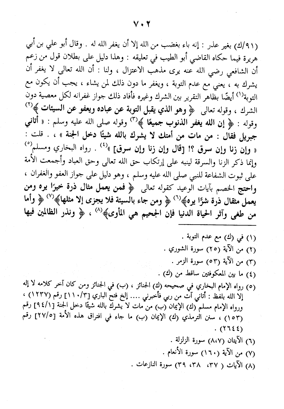 وقال أبو علي بن أبي هريرة فيما حكاه القاضي أبو الطيب في تعليقه: وهذا دليل على بطلان قول من زعم أن الشافعي رضي الله عنه يرى مذهب الاعتزال ولنا: أن الله تعالى لا يغفر أن يشرك به يعني مع عدم التوبة، ويغفر ما دون ذلك لمن يشاء، يجب أن يكون مع التوبة أيضا بظاهر التقرير بين الشرك وغيره فأفاد ذلك جواز غفرانه لكل معصية دون الشرك وقوله تعالى: {وهو الذي يقبل التوبة عن عباده ويعفو عن السيئات} وقوله: {إن الله يغفر الذنوب جميعا} وقوله صلى الله عليه وسلم: ((أتاني جبريل فقال: من مات من أمتك لا يشرك بالله شيئا دخل الجنة)) قلت: ((وإن زنا وإن سرق؟ قال: وإن زنا وإن سرق)) رواه البخاري ومسلم وإنما ذكر الزنا والسرقة لينبه على ارتكاب حق الله تعالى وحق العباد وأجمعت الأمة على ثبوت الشفاعة للنبي صلى الله عليه وسلم وهو دليل على جواز العفو والغفران، واحتج الخصم بآيات الوعيد كقوله تعالى: {فمن يعمل مثقال ذرة خيراً يره ومن يعمل مثقال ذرة شراً يره} {ومن جاء بالسيئة فلا يجزى إلا مثلها} {وأما من طغى وآثر الحياة الدنيا فإن الجحيم هو المأوى} {ونذر الظالمين فيها
