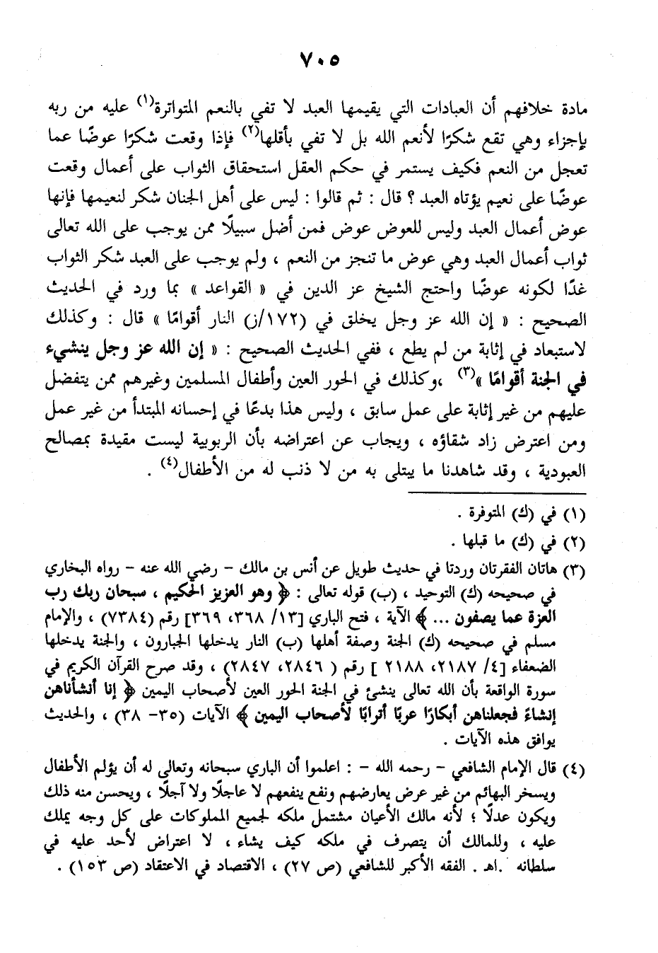 مادة خلافهم أن العبادات التي يقيمها العبد لا تفي بالنعم المتواترة عليه من ربه بإجزاء وهي تقع شكرا لأنعم الله بل لا تفي بأقلها فإذا وقعت شكرا عوضا عما تعجل من النعم فكيف يستمر في حكم العقل استحقاق الثواب على أعمال وقعت عوضا على نعيم يؤتاه العبد؟ قال: ثم قالوا: ليس على أهل الجنان شكر لنعيمها فإنها عوض أعمال العبد وليس للعوض عوض فمن أضل سبيلا ممن يوجب على الله تعالى ثواب أعمال العبد وهي عوض ما تنجز من النعم، ولم يوجب على العبد شكر الثواب غدا لكونه عوضا واحتج الشيخ عز الدين في (القواعد) بما ورد في الحديث الصحيح: ((إن الله عز وجل يخلق في (١٧٢/ز) النار أقواما)) قال: وكذلك لاستبعاد في إثابة من لم يطع، ففي الحديث الصحيح: ((إن الله عز وجل ينشئ في الجنة أقواما)) وكذلك في الحور العين وأطفال المسلمين وغيرهم ممن يتفضل عليهم من غير إثابة على عمل سابق، وليس هذا بدعا في إحسانه المبتدأ من غير عمل ومن اعترض زاد شقاؤه ويجاب عن اعتراضه بأن الربوبية ليست مقيدة بمصالح العبودية، وقد شاهدنا ما يبتلى به من لا ذنب له من الأطفال.