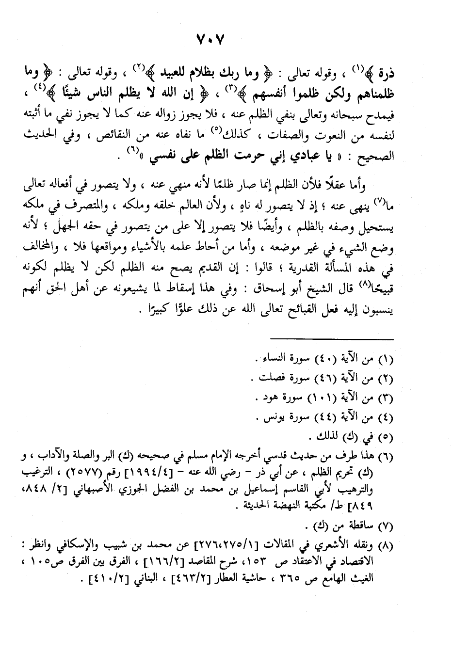ذرة} وقوله تعالى: {وما ربك بظلام للعبيد} وقوله تعالى: {وما ظلمناهم ولكن ظلموا أنفسهم} {إن الله لا يظلم الناس شيئا} فيمدح سبحانه وتعالى بنفي الظلم عنه، فلا يجوز زواله عنه كما لا يجوز نفي ما أثبته لنفسه من النعوت والصفات، كذلك ما نفاه عنه من النقائص وفي الحديث الصحيح: ((يا عبادي إني حرمت الظلم على نفسي)).