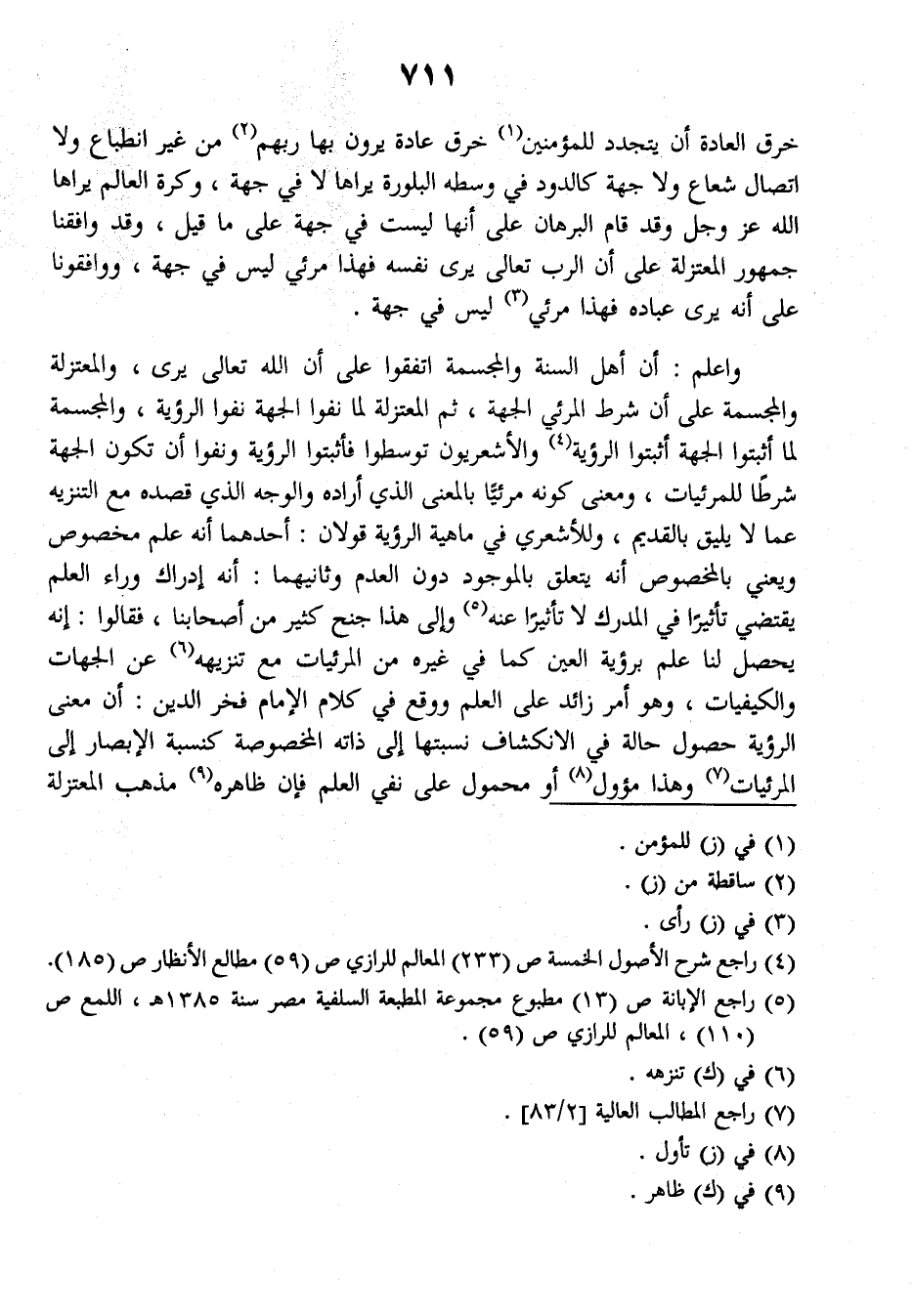واعلم: أن أهل السنة والمجسمة اتفقوا على أن الله تعالى يرى، والمعتزلة والمجسمة على أن شرط المرئي الجهة، ثم المعتزلة لما نفوا الجهة نفوا الرؤية، والمجسمة لم أثبتوا الجهة أثبتوا الرؤية والأشعريون توسطوا فأثبتوا الرؤية ونفوا أن تكون الجهة شرطا للمرئيات، ومعنى كونه مرئيا بالمعنى الذي أراده والوجه الذي قصده مع التنزيه عما لا يليق بالقديم، وللأشعري في ماهية الرؤية قولان: أحدهما أنه علم مخصوص ويعني بالمخصوص أنه يتعلق بالموجود دون العدم وثانيهما: أنه إدراك وراء العلم يقتضي تأثيرا في المدرك لا تأثيرا عنه وإلى هذا جنح كثير من أصحابنا فقالوا: إنه يحصل لنا علم برؤية العين كما في غيره من المرئيات مع تنزيهه عن الجهات والكيفيات وهو أمر زائد على العلم ووقع في كلام الإمام فخر الدين: أن معنى الرؤية حصول حالة في الانكشاف نسبتها إلى ذاته المخصوصة كنسبة الإبصار إلى المرئيات وهذا مؤول أو محمول على نفي العلم فإن ظاهره مذهب المعتزلة