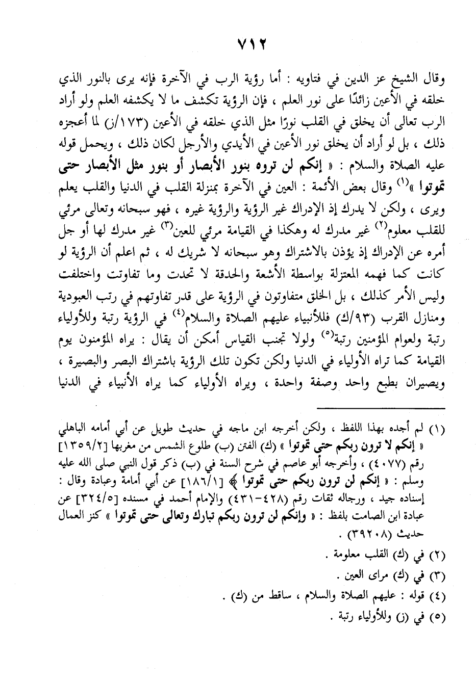وقال الشيخ عز الدين في فتاويه: أما رؤية الرب في الآخرة فإنه يرى بالنور الذي خلقه في الأعين زائدا على نور العلم، فإن الرؤية تكشف ما لا يكشفه العلم ولو أراد الرب تعالى أن يخلق في القلب نورا مثل الذي خلقه في الأعين (١٧٣/ز) لما أعجزه ذلك بل لو أراد أن يخلق نور الأعين في الأيدي والأرجل لكان ذلك، ويحمل قوله عليه الصلاة والسلام: ((إنكم لن تروه بنور الأبصار أو بنور مثل الأبصار حتى تموتوا)) وقال بعض الأئمة: العين في الآخرة بمنزلة القلب في الدنيا والقلب يعلم ويرى ولكن لا يدرك إذ الإدراك غير الرؤية والرؤية غيره، فهو سبحانه وتعالى مرئي للقلب معلوم غير مدرك له وهكذا في القيامة مرئي للعين، غير مدرك لها أو جل أمره عن الإدراك إذ يؤذن بالاشتراك وهو سبحانه لا شريك له، ثم اعلم أن الرؤية لو كانت كما فهمه المعتزلة بواسطة الأشعة والحدقة لا تحدت= وما تفاوتت واختلفت وليس الأمر كذلك، بل الخلق