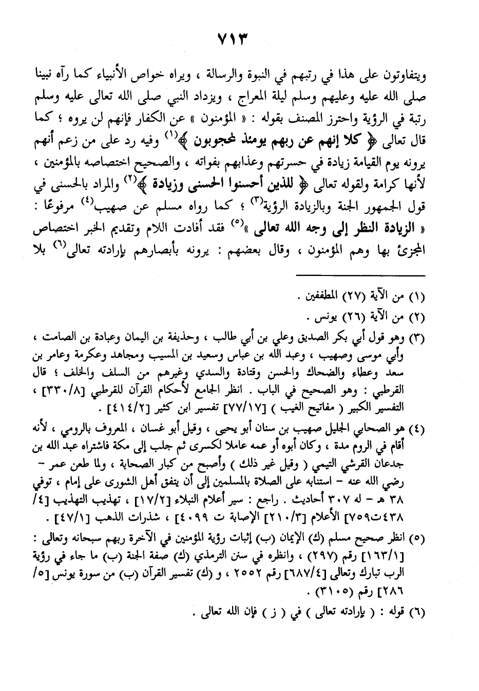 ويتفاوتون على هذا في رتبهم في النبوة والرسالة، ويراه خواص الأنبياء كما رآه نبينا صلى الله عليه وعليم وسلم ليلة المعراج، ويزداد النبي صلى الله تعالى عليه وسلم رتبة في الرؤية واحترز المصنف بقوله: (المؤمنون) عن الكفار فإنهم لن يروه، كما قال تعالى: {كلا إنهم عن ربهم يومئذ لمحجوبون} وفيه رد على من زعم أنهم يرونه يوم القيامة زيادة في حسرتهم وعذابهم بفواته، والصحيح اختصاصه بالمؤمنين، لأنها كرامة ولقوله تعالى: {للذين أحسنوا الحسنى وزيادة} والمراد بالحسنى في قول الجمهور الجنة وبالزيادة الرؤية كما رواه مسلم عن صهيب مرفوعا: ((الزيادة النظر إلى وجه الله تعالى)) فقد أفادت اللام وتقديم الخبر اختصاص المجزئ بها وهم المؤمنون وقال بعضهم: يرونه بأبصارهم بإرادته تعالى بلا