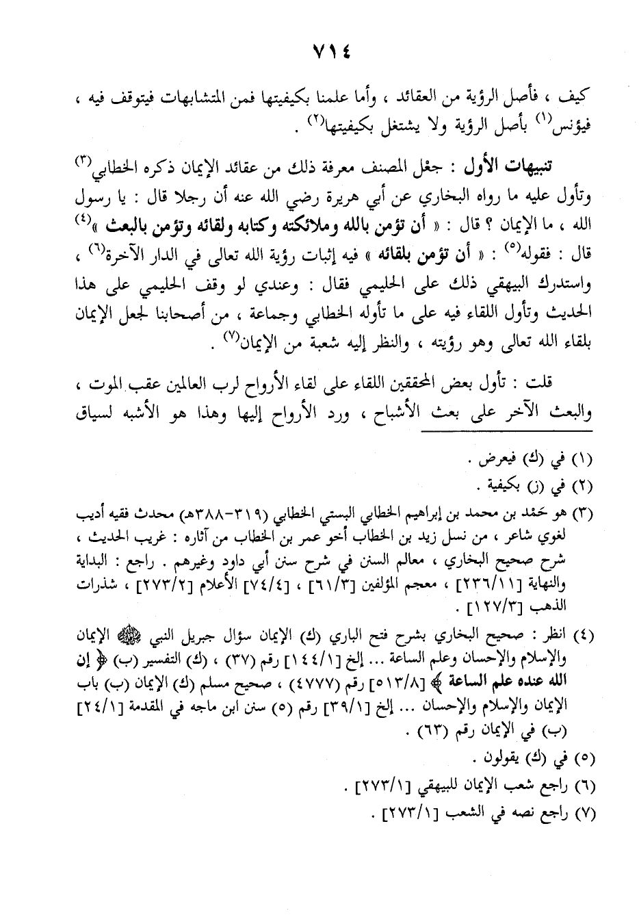 تنبيهات الأول: جعل المصنف معرفة ذلك من عقائد الإيمان ذكره الخطابي وتأول عليه ما رواه البخاري عن أبي هريرة رضي الله عنه أن رجلا قال: يا رسول الله، ما الإيمان؟ قال: ((أن تؤمن بالله وملائكته وكتابه ولقائه وتؤمن بالبعث)) قال: فقوله: ((أن تؤمن بلقائه)) فيه إثبات رؤية الله تعالى في الدار الآخرة واستدرك البيهقي ذلك على الحليمي فقال: وعندي لو وقف الحليمي على هذا الحديث وتأول اللقاء فيه على ما تأوله الخطابي وجماعة، من أصحابنا لجعل الإيمان بلقاء الله تعالى وهو رؤيته، والنظر إليه شعبة من الإيمان.