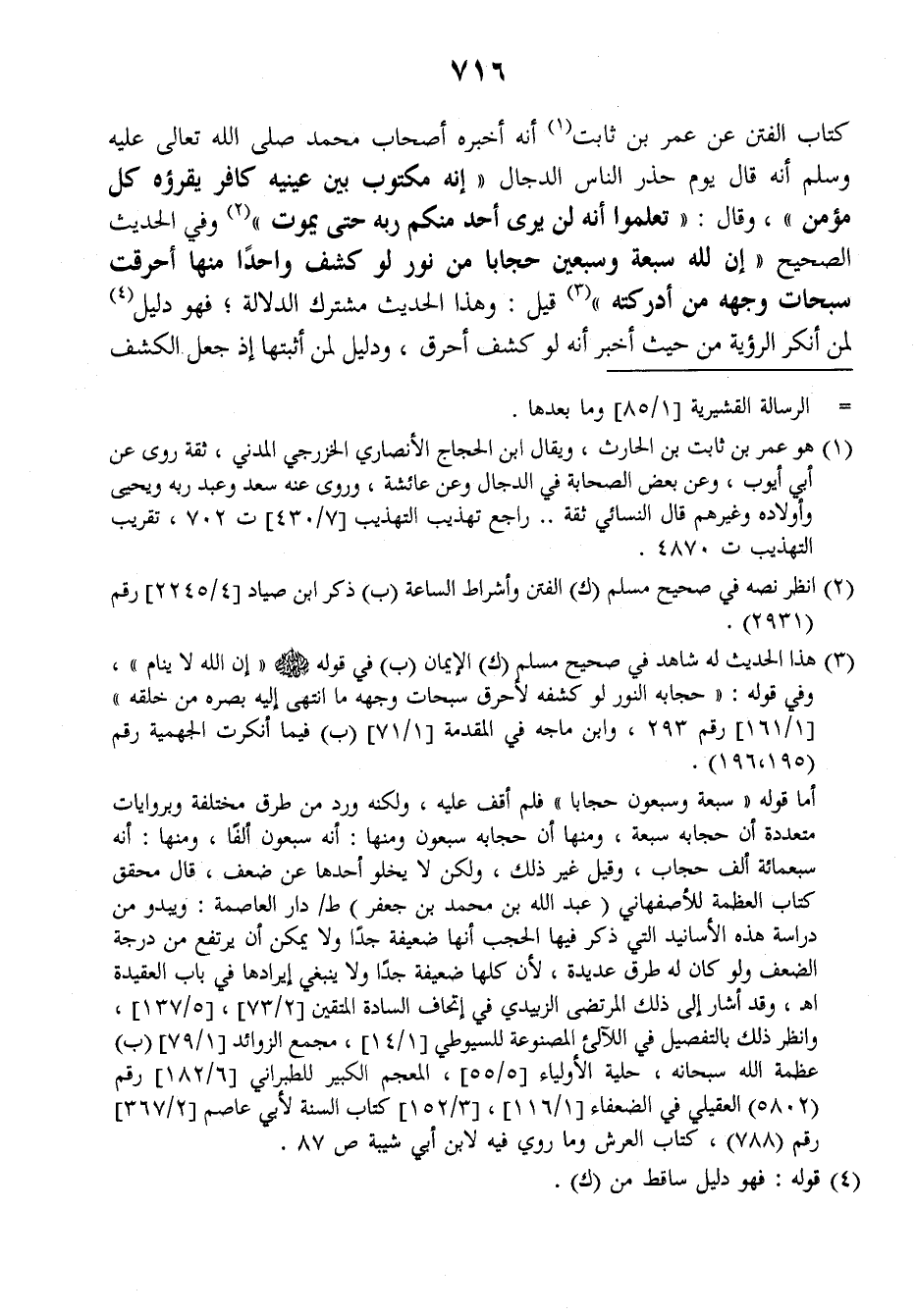 كتاب الفتن عن عمر بن ثابت أنه أخبره أصحاب محمد صلى الله تعالى عليه وسلم أنه قال يوم حذر الناس الدجال: ((إنه مكتوب بين عينيه كافر يقرؤه كل مؤمن)) وقال: ((تعلموا أنه لن يرى أحد منكم ربه حتى يموت)) وفي الحديث الصحيح: ((إن لله سبعة وسبعين حجابا من نور لو كشف واحدا منها أحرقت سبحات وجهه من أدركته)) قيل: وهذا الحديث مشترك الدلالة فهو دليل لمن أنكر الرؤية من حيث أخبر أنه لو كشف أحرق، ودليل لمن أثبتها إذ جعل الكشف