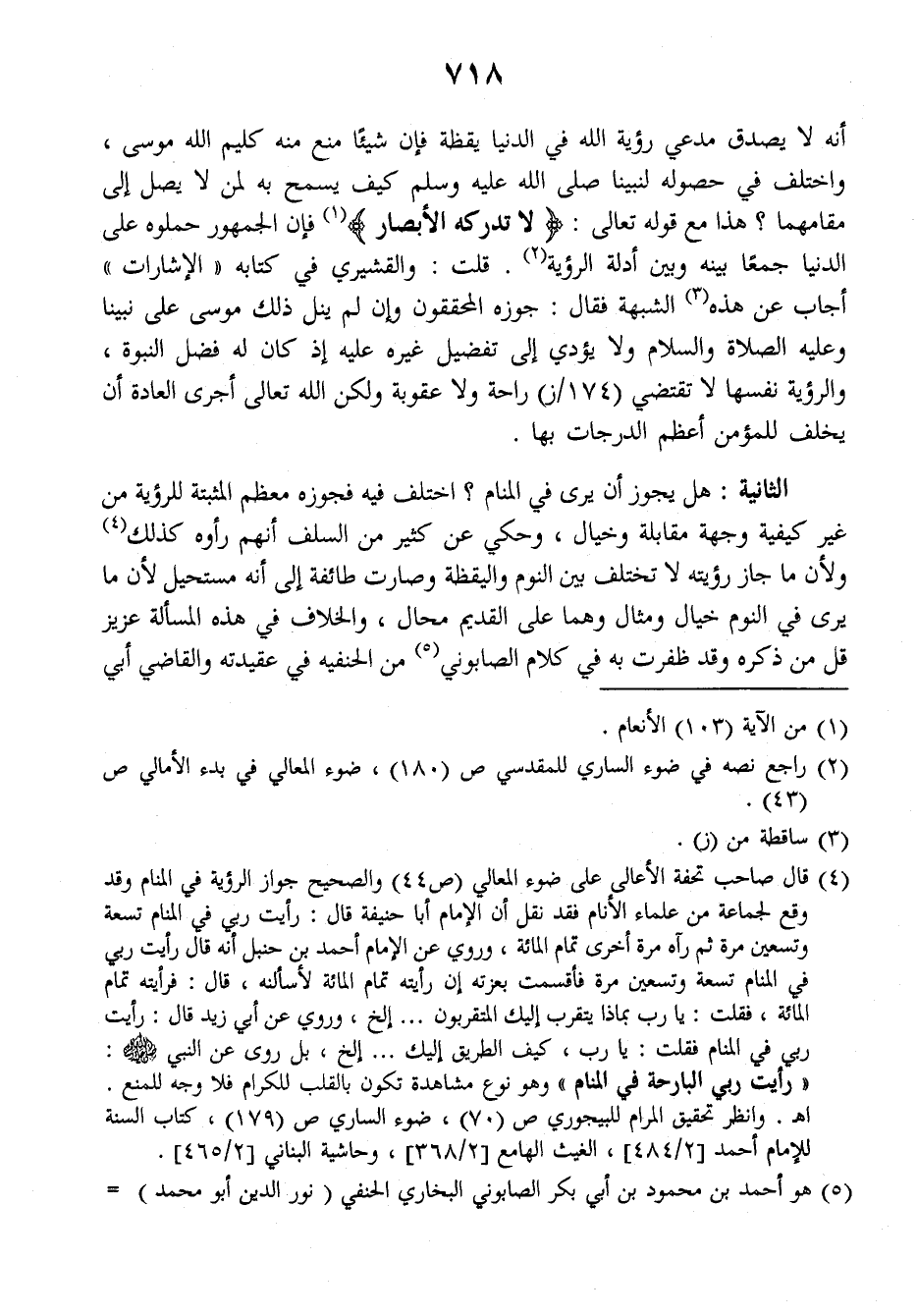 الثانية: هل يجوز أن يرى في المنام؟ اختلف فيه فجوزه معظم المثبتة للرؤية من غير كيفية وجهة مقابلة وخيال، وحكي عن كثير من السلف أنهم رأوه كذلك ولأن ما جاز رؤيته لا تختلف بين النوم واليقظة وصارت طائفة إلى أنه مستحيل لأن ما يرى في النوم خيال ومثال وهما على القديم محال، والخلاف في هذه المسألة عزيز قل من ذكره وقد ظفرت به في كلام الصابوني من الحنفية في عقيدته والقاضي أبي