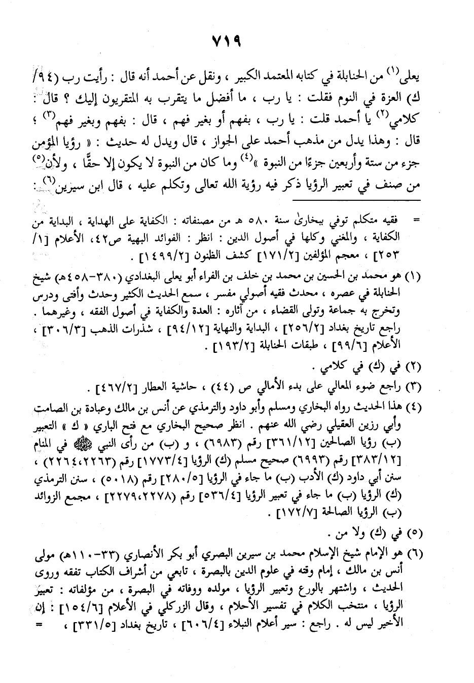 يعلى من الحنابلة في كتابه (المعتمد الكبير)، ونقل عن أحمد أنه قال: رأيت رب (٩٤/ك) العزة في النوم فقلت: يا رب، ما أفضل ما يتقرب به المتقربون إليك؟ قال: كلامي يا أحمد قلت: يا رب، بفهم أو بغير فهم، قال: بفهم وبغير فهم قال: وهذا يدل من مذهب أحمد على الجواز، قال: ويدل له حديث: ((رؤيا المؤمن جزء من ستة وأربعين جزءا من النبوة)) وما كان من النبوة لا يكون إلا حقا ولأن من صنف في تعبير الرؤيا ذكر فيه رؤية الله تعالى وتكلم عليه، قال ابن سيرين: