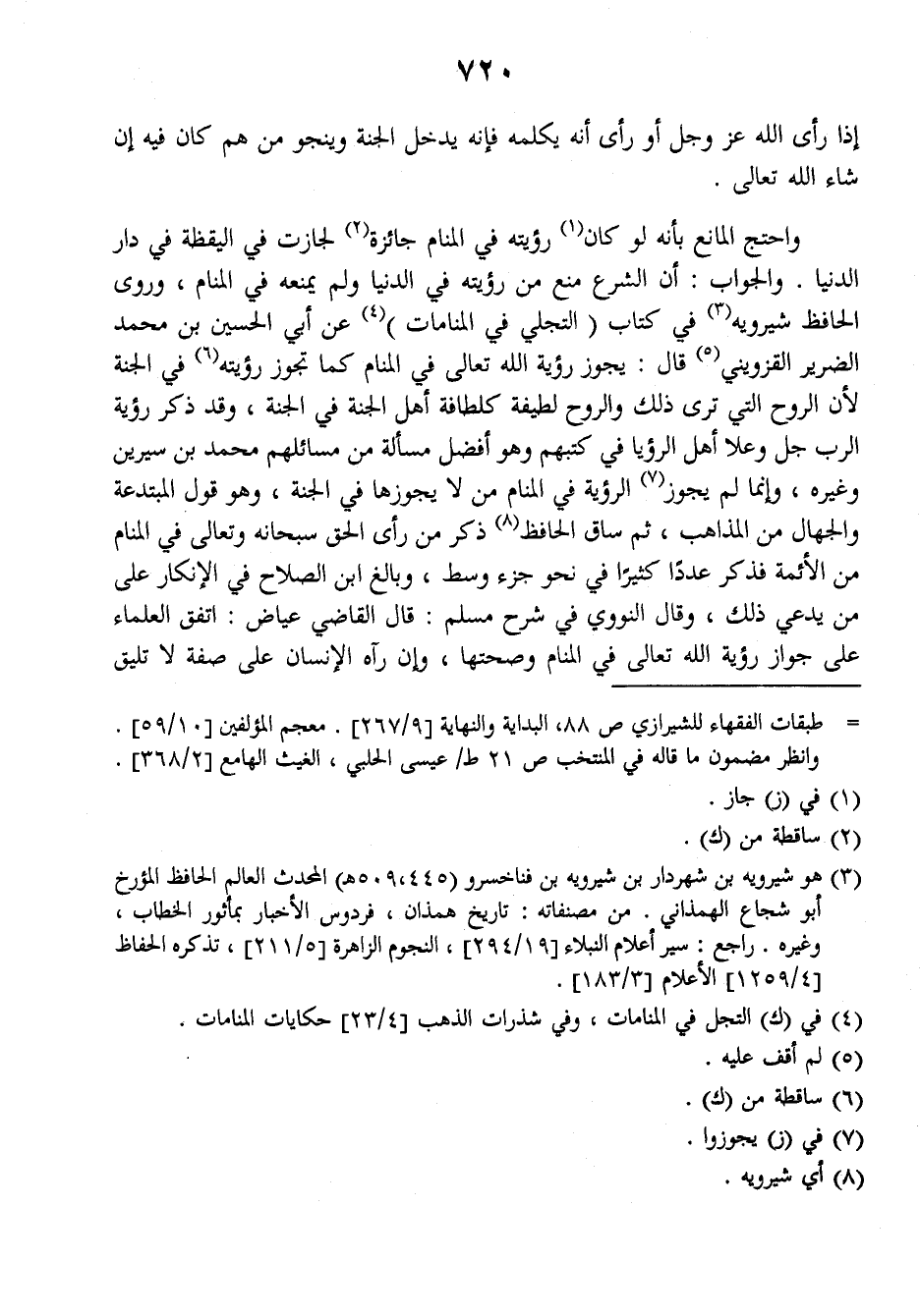 واحتج المانع بأنه لو كان رؤيته في المنام جائزة لجازت في اليقظة في دار الدنيا. والجواب: أن الشرع منع من رؤيته في الدنيا ولم يمنعه في المنام، وروى الحافظ شيرويه في كتاب (التجلي في المنامات) عن أبي الحسين بن محمد الضرير القزويني قال: يجوز رؤية الله تعالى في المنام كما تجوز رؤيته في الجنة لأن الروح التي ترى ذلك والروح لطيفة كلطافة أهل الجنة في الجنة، وقد ذكر رؤية الرب جل وعلا أهل الرؤيا في كتبهم وهو أفضل مسألة من مسائلهم محمد بن سيرين وغيره، وإنما لم يجوز الرؤية في المنام من لا يجوزها في الجنة، وهو قول المبتدعة والجهال من المذاهب، ثم ساق الحافظ ذكر من رأى الحق سبحانه وتعالى في المنام من الأئمة فذكر عدداً كثيرا في نحو جزء وسط، وبالغ ابن الصلاح في الإنكار على من يدعي ذلك، وقال النووي في (شرح مسلم): قال القاضي عياض: اتفق العلماء على جواز رؤية الله تعالى في المنام، وصحتها، وإن رآه الإنسان على صفة لا تليق