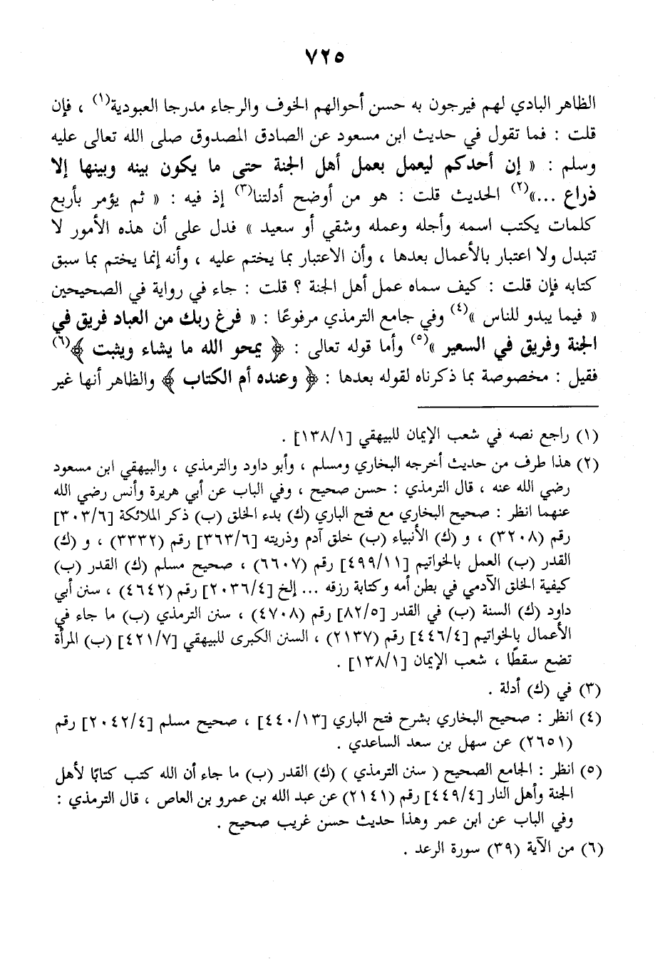 الظاهر البادي لهم فيرجون به حسن أحوالهم الخوف والرجاء مدرجا العبودية، فإن قلت: فما تقول في حديث ابن مسعود عن الصادق المصدوق صلى الله تعالى عليه وسلم: ((إن أحدكم ليعمل بعمل أهل الجنة حتى ما يكون بينه وبينها إلا ذراع)) الحديث قلت: هو من أوضح أدلتنا إذ فيه: ((ثم يؤمر بأربع كلمات يكتب اسمه وأجله وعمله وشقي أو سعيد)) فدل على أن هذه الأمور لا تتبدل ولا اعتبار بالأعمال بعدها، وأن الاعتبار بما يختم عليه، وأنه إنما يختم بما سبق كتابه فإن قلت: كيف سماه عمل أهل الجنة؟ قلت: جاء في رواية في الصحيحين ((فيما يبدو للناس)) وفي (جامع الترمذي) مرفوعا: ((فرغ ربك في العباد فريق في الجنة وفريق في السعير)) وأما قوله تعالى: {يمحو الله ما يشاء ويثبت} فقيل: مخصوصة بما ذكرناه لقوله بعدها: {وعنده أم الكتاب} والظاهر أنها غير
