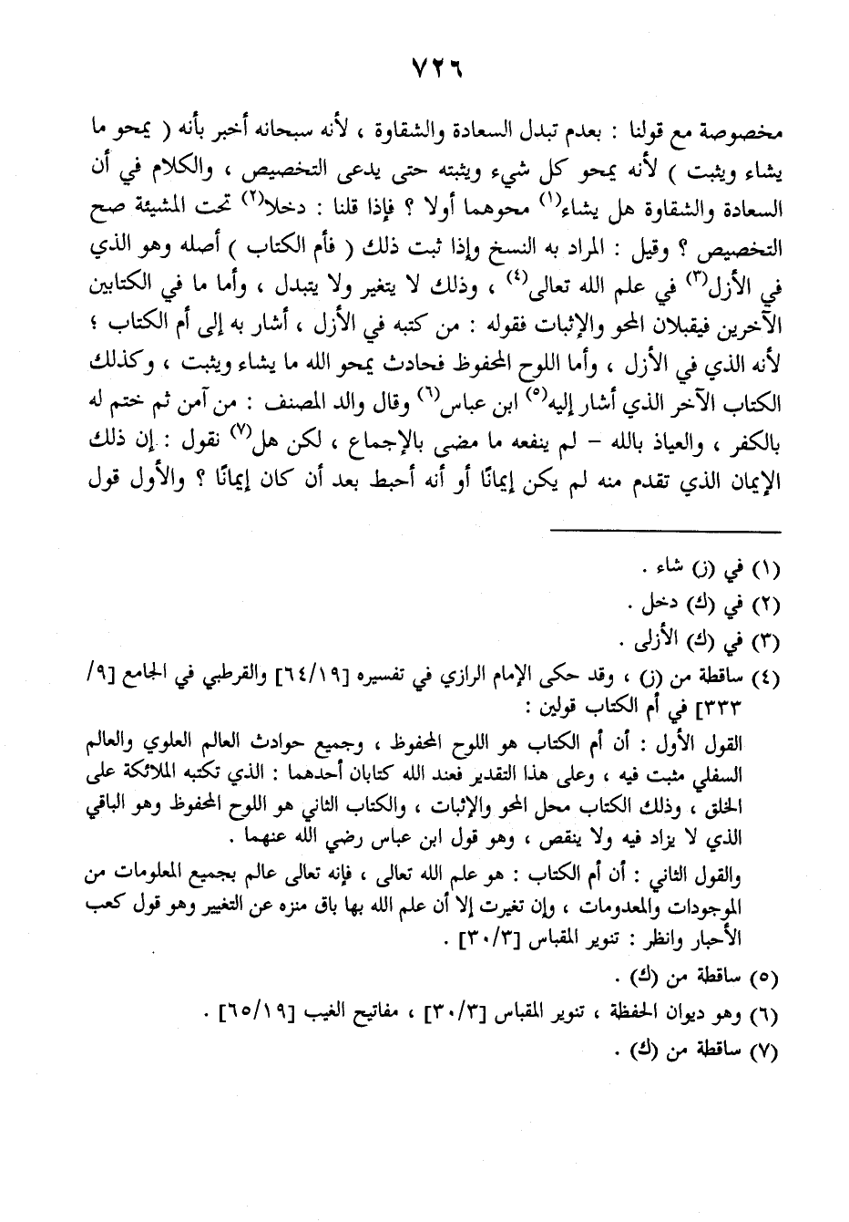 مخصوصة مع قولنا: بعدم تبدل السعادة والشقاوة لأنه سبحانه أخبر بأنه (يمحوا ما يشاء ويثبت) لأنه يمحو كل شيء ويثبته حتى يدعى التخصيص، والكلام في أن السعادة والشقاوة هل يشاء محوهما أو لا؟ فإذا قلنا: دخلا تحت المشيئة صح التخصيص؟ وقيل: المراد به النسخ وإذا ثبت ذلك (فأم الكتاب) أصله وهو الذي في الأزل في علم الله تعالى، وذلك لا يتغير ولا يتبدل، وأما ما في الكتابين الآخرين فيقبلان المحو والإثبات فقوله: من كتبه في الأزل، أشار به إلى أم الكتاب لأنه الذي في الأزل، وأما اللوح المحفوظ فحادث يمحو الله ما يشاء ويثبت، وكذلك الكتاب الآخر الذي أشار إليه ابن عباس وقال والد المصنف: من آمن ثم ختم له بالكفر، والعياذ بالله لم ينفعه ما مضى بالإجماع، لكن هل نقول: إن ذلك الإيمان الذي تقدم منه لم يكن إيمانا أو أنه