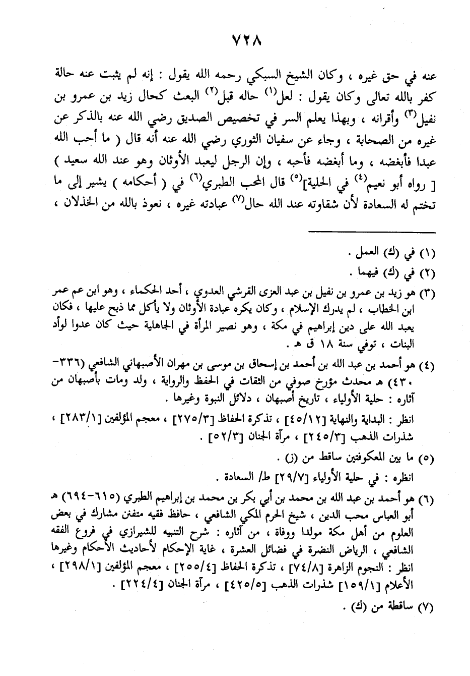 عنه في حق غيره، وكان الشيخ السبكي رحمه الله يقول: إنه لم يثبت عنه حالة كفر بالله تعالى وكان يقول: لعل حاله قبل البعث كحال ز يد بن عمرو بن نفيل وأقرانه، وبهذا يعلم السر في تخصيص الصديق رضي الله عنه بالذكر عن غيره من الصحابة، وجاء عن سفيان الثوري رضي الله عنه أنه قال (ما أحب الله عبدا فأبغضه وما أبغضه فأحبه، وإن الرجل ليعبد الأوثان وهو عند الله سعيد) رواه أبو نعيم في (الحلية) قال المحب الطبري في (أحكامه) يشير إلى ما تختم له السعادة لأن شقاوته عند الله حال عبادته غيره، نعوذ بالله من الخذلان