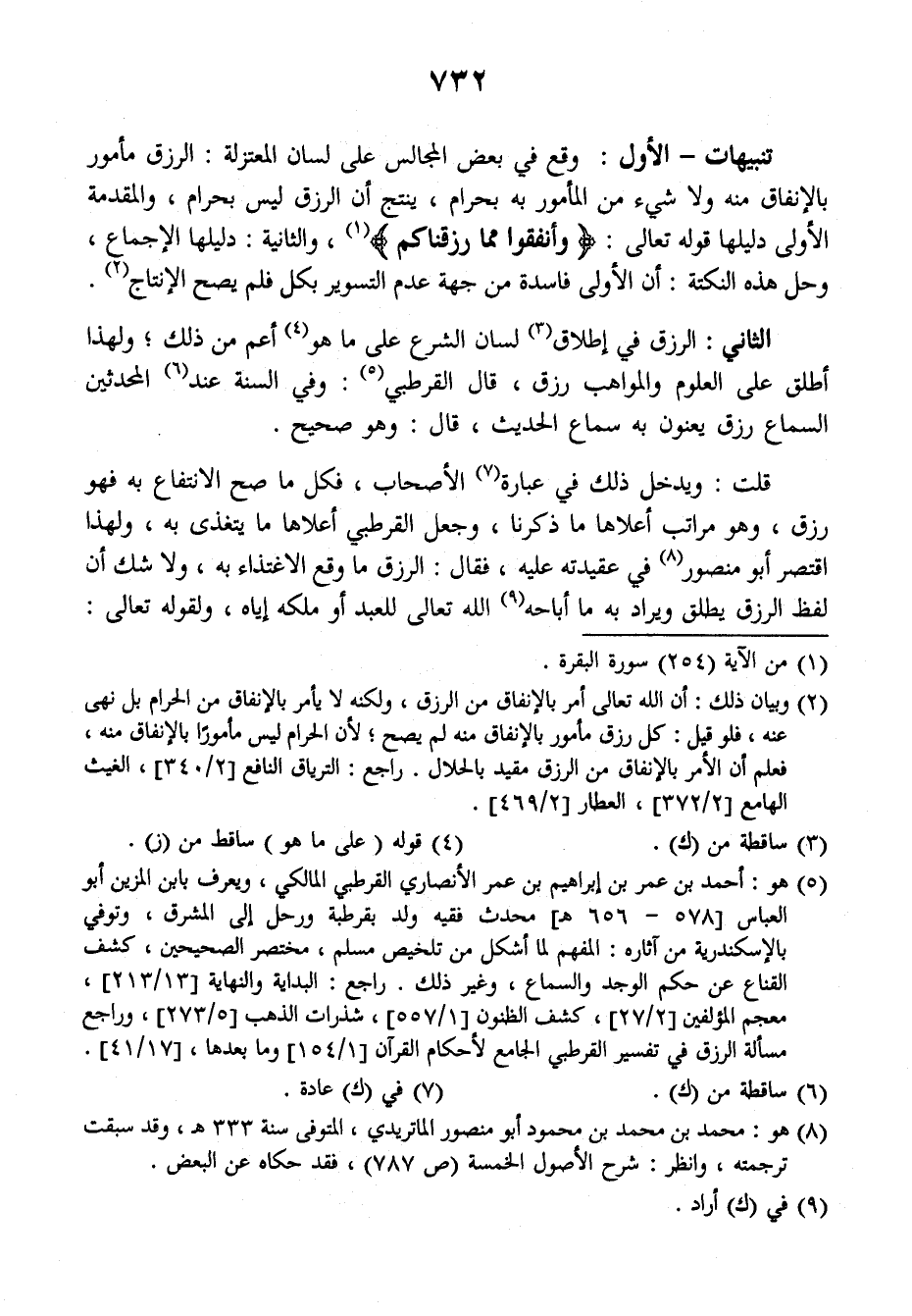 قلت: ويدخل ذلك في عبارة الأصحاب فكل ما صح الانتفاع به فهو رزق، وهو مراتب أعلاها ما ذكرنا، وجعل القرطبي أعلاها ما يتغذى به، ولهذا اقتصر أبو منصور في عقيدته عليه، فقال: الرزق ما وقع الإغتذاء به ولا شك أن لفظ الرزق يطلق ويراد به ما أباحه الله تعالى للعبد أو ملكه إياه ولقوله تعالى: