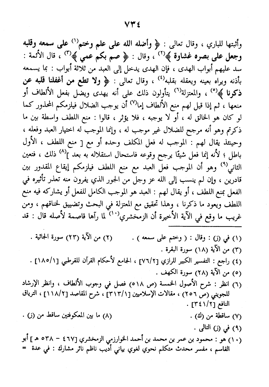 وأثبتها للباري وقال تعالى: {وأضله الله على علم وختم على سمعه وقلبه وجعل على بصره غشاوة} وقال: {صم بكم عمي} قال الأئمة: سد عليهم أبواب الهدى، فإن الهدى يدخل إلى العبد من ثلاثة أبواب: بما يسمعه بأذنه ويراه بعينه ويعقله بقلبه، وقال تعالى: {ولا تطع من أغفلنا قلبه عن ذكرنا} والمعتزلة يتأولون ذلك على أنه يهدي ويضل بفعل الألطاف أو منعها ثم إذا قيل لهم منع الألطاف إما أن يوجب الضلال فيلزمكم المحذور كما لو كان هو الخالق له، أو لا يوجبه، فلا يؤثر قالوا: منع اللطف واسطة بين ما ذكرتم وهو أنه مرجح للضلال غير موجب له، وإنما الموجب له اختيار العبد وفعله، وحينئذ يقال لهم: الموجب له فعل المكلف وحده أو مع منع اللطف، الأول باطل، لأنه إنما فعل شيئا يرجح وقوعه فاستحال استقلاله به بعد ذلك، فتعين الثاني وهو أن الموجب فعل العبد مع منع اللطف فيلزمكم إيقاع المقدور بين قادرين، وإن لم ينسب إلى الله عز وجل من الجور الذي يفرون منه تعذر تأثيره في الفعل بمنع اللطف، أو يقال لهم: العبد هو الموجب الكامل للفعل أو يشاركه فيه منع اللطف ويعود ما ذكرنا، وهذا تحقيق مع المعتزلة في البحث وتضييق لخناقهم ومن غريب ما وقع في الآية الأخيرة أن الزمخشري لما رآها قاصمة لأصله قال: قد