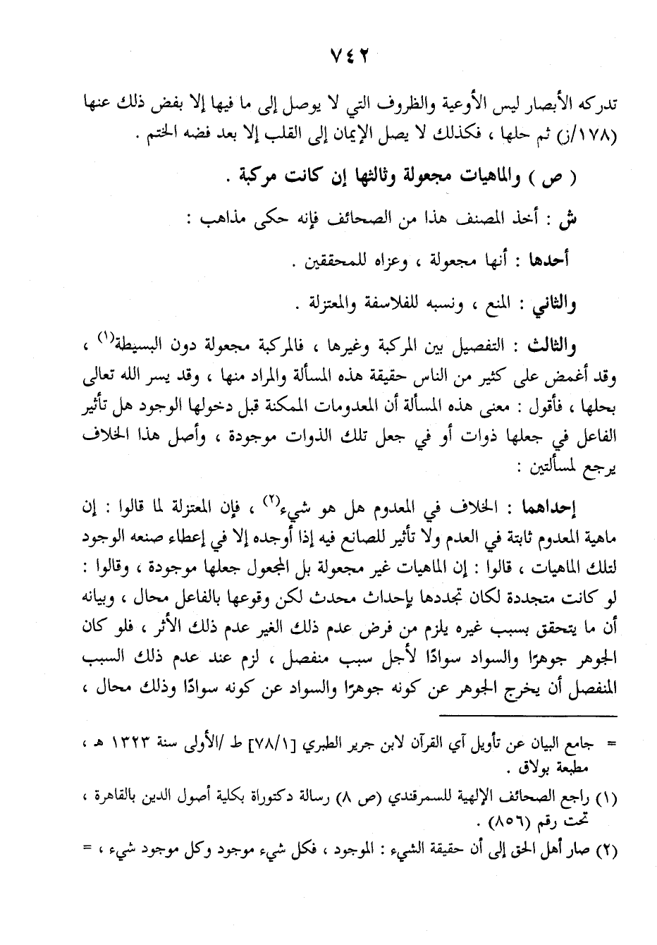 والثالث: التفصيل بين المركبة وغيرها، فالمركبة مجعولة دون البسيطة وقد أغمض على كثير من الناس حقيقة هذه المسألة والمراد منها، وقد يسر الله تعالى بحلها، فأقول: معنى هذه المسألة أن المعدومات الممكنة قبل دخولها الوجود هل تأثير الفاعل في جعلها ذوات أو في جعل تلك الذوات موجودة، وأصل هذا الخلاف يرجع لمسألتين: