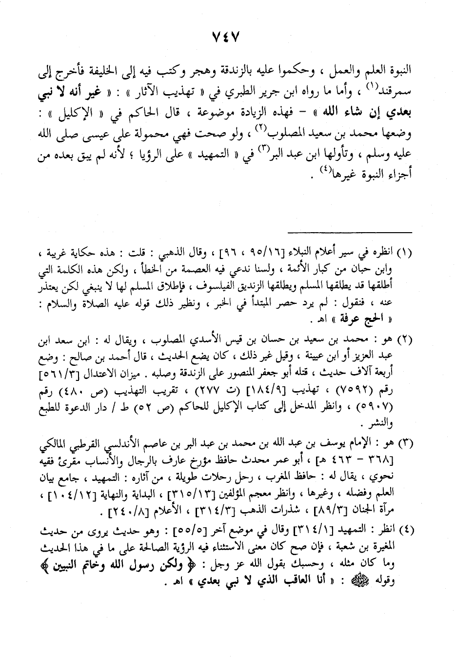 النبوة العلم والعمل، وحكموا عليه بالزندقة وهجر وكتب فيه إلى الخليفة فأخرج إلى سمرقند وأما ما رواه ابن جرير الطبري في (تهذيب الآثار): ((غير أنه لا نبي بعدي إن شاء الله)): فهذه الزيادة موضوعة قال الحاكم في (الإكليل): وضعها محمد بن سعيد المصلوب ولو صحت فهي محمولة على عيسى صلى الله عليه وسلم وتأولها ابن عبد البر في (التمهيد) على الرؤيا، لأنه لم يبق بعده من أجزاء النبوة غيرها.