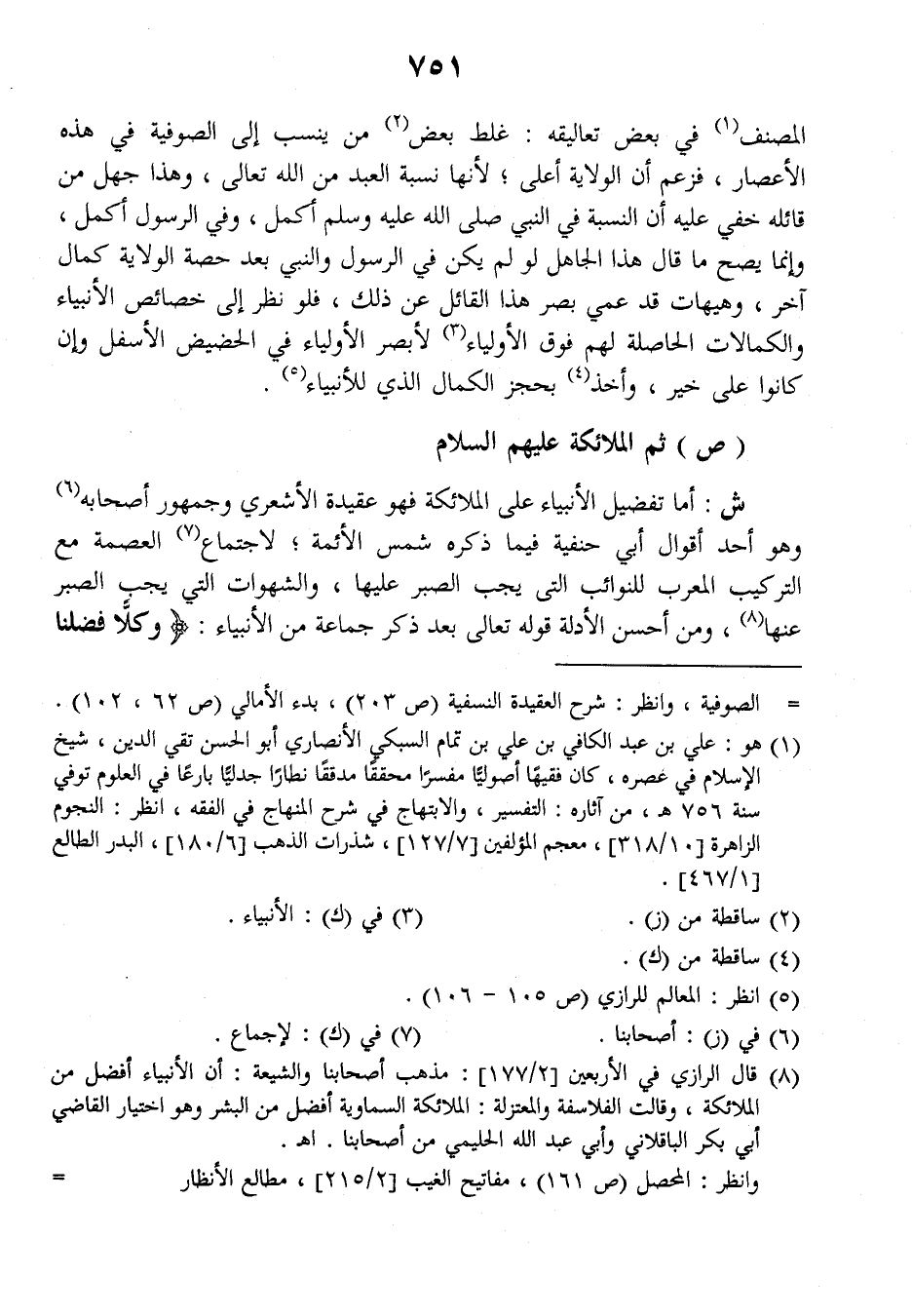 ش: أما تفضيل الأنبياء على الملائكة فهو عقيدة الأشعري وجمهور أصحابه وهو أحد أقوال أبي حنفية فيما ذكره شمس الأئمة، لاجتماع العصمة مع التركيب المعرب للنوائب التي يجب الصبر عليها، والشهوات التي يجب الصبر عنها ومن أحسن الأدلة قوله تعالى بعد ذكر جماعة من الأنبياء: {وكلا فضلنا