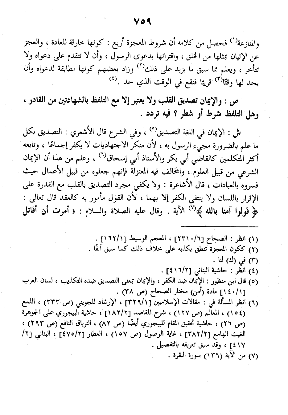 ش: الإيمان في اللغة التصديق، وفي الشرع قال الأشعري: التصديق بكل ما علم بالضرورة مجيء الرسول به، لأن منكر الاجتهاديات لا يكفر إجماعا، وتابعه أكثر المتكلمين كالقاضي أبي بكر والأستاذ أبي إسحاق، وعلم من هذا أن الإيمان الشرعي من قبيل العلوم، والمخالف فيه المعتزلة فإنهم جعلوه من قبيل الأعمال حيث فسروه بالعبادات قال الأشاعرة: ولا يكفي مجرد التصديق بالقلب مع القدرة على الإقرار باللسان ولا ينتفي الكفر إلا بهما، لأن القول مأمور به كالعقد قال تعالى: {قولوا آمنا بالله} الآية. وقال عليه الصلاة والسلام: ((أمرت أن أقاتل