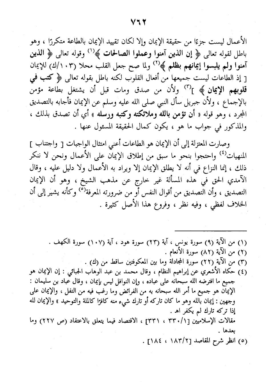 الأعمال ليست جزءا من حقيقة الإيمان وإلا لكان تقييد الإيمان بالطاعة متكررا، وهو باطل لقوله تعالى: {إن الذين آمنوا وعملوا الصالحات} وقوله تعالى: {الذين آمنوا ولم يلبسوا إيمانهم بظلم} ولما صح جعل القلب محلا (١٠٣/ك) للإيمان إذ الطاعات ليست جميعها من أفعال القلوب لكنه باطل بقوله تعالى: {كتب في قلوبهم الإيمان} ولأن من صدق ومات قبل أن يشتغل بطاعة مؤمن بالإجماع، ولأن جبريل سأل النبي صلى الله عليه وسلم عن الإيمان فأجابه بالتصديق المجرد، وهو قوله: ((أن تؤمن بالله وملائكته وكتبه ورسله)) أي أن تصدق بذلك والمذكور في جواب ما هو، يكون كمال الحقيقة المسؤول عنها.