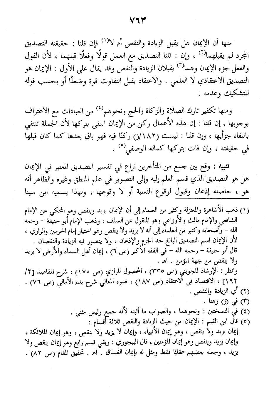 منها أن الإيمان هل يقبل الزيادة والنقص أم لا، فإن قلنا: حقيقته التصديق المجرد لم يقبلهما، وإن: قلنا التصديق مع العمل قولا وفعلا قبلهما، لأن القول والفعل جزء الإيمان وهما يقبلان الزيادة والنقص وقد يقال على الأول: الإيمان هو التصديق الاعتقادي لا العلمي. والاعتقاد يقبل التفاوت قوة وضعفا أو بحسب قوله للتشكيك وعدمه.