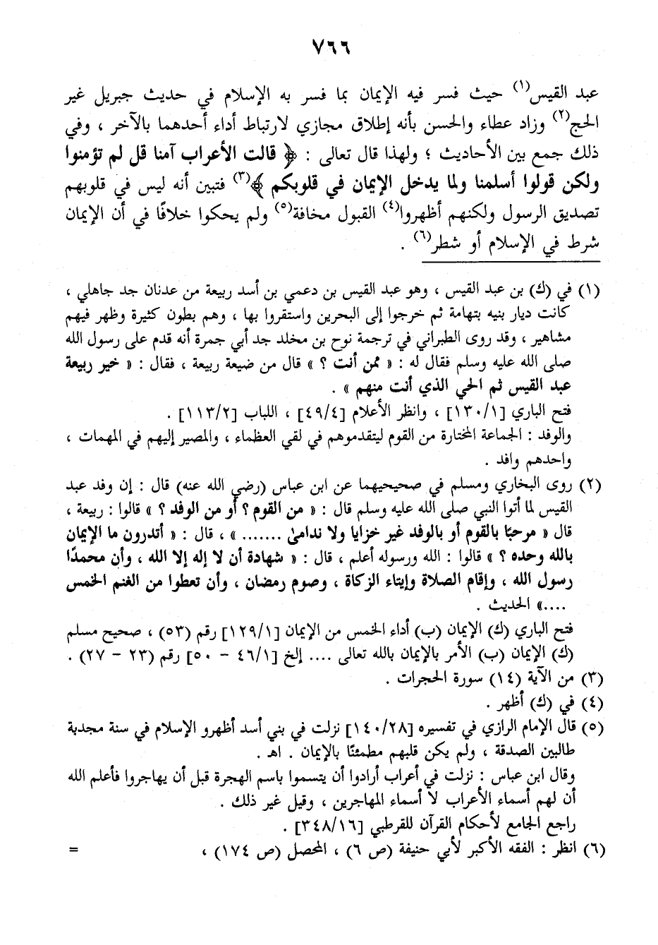 عبد القيس حيث فسر فيه الإيمان بما فسر به الإسلام في حديث جبريل غير الحج وزاد عطاء والحسن بأنه إطلاق مجازي لارتباط أداء أحدهما بالآخر، وفي ذلك جمع بين الأحاديث ولهذا قال تعالى: {قالت الأعراب آمنا قل لم تؤمنوا ولكن قولوا أسلمنا ولما يدخل الإيمان في قلوبكم} فتبين أنه ليس في قلوبهم تصديق الرسول ولكنهم أظهروا القبول مخافة ولم يحكوا خلافا في أن الإيمان شرط في الإسلام أو شطر.